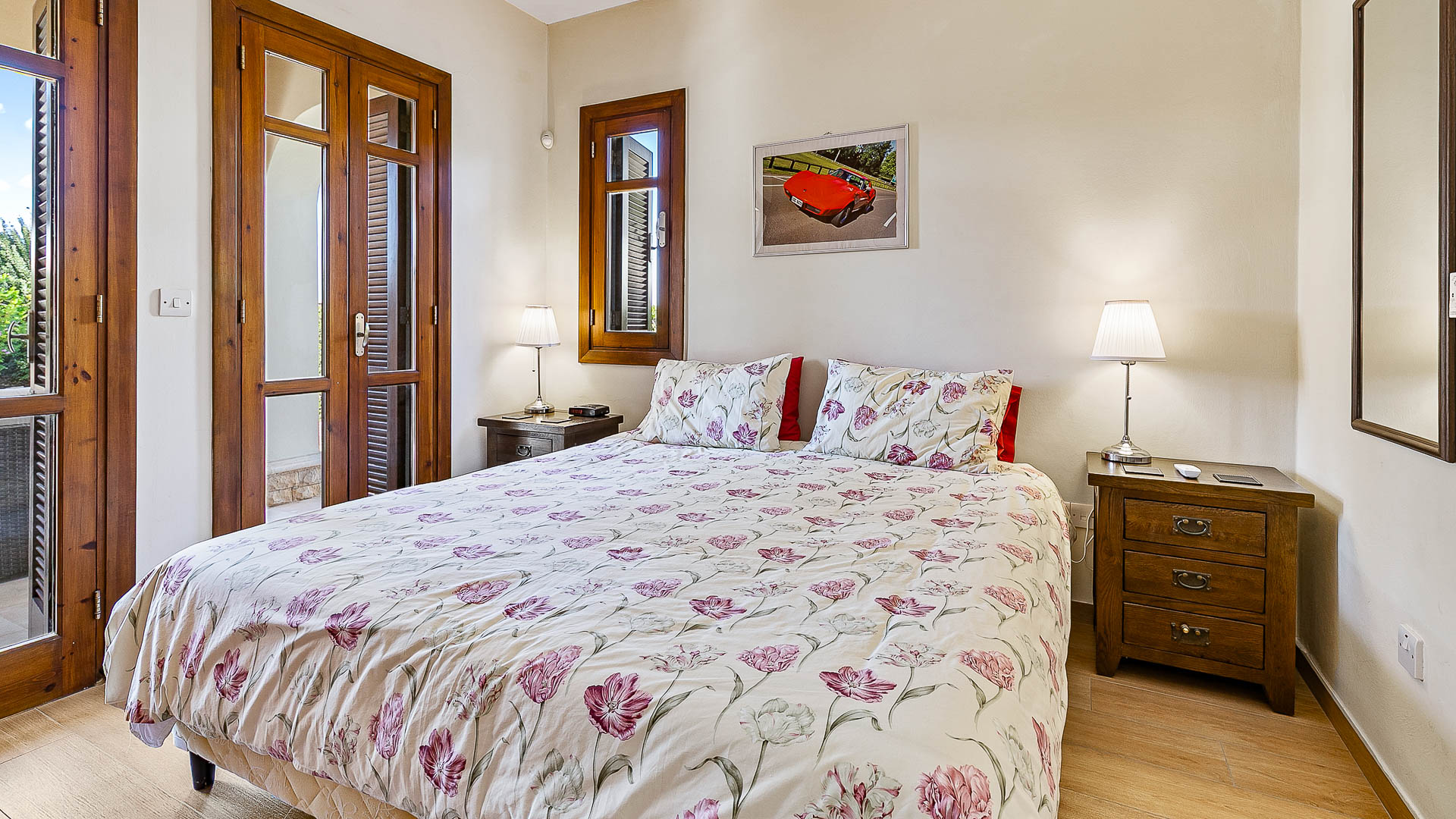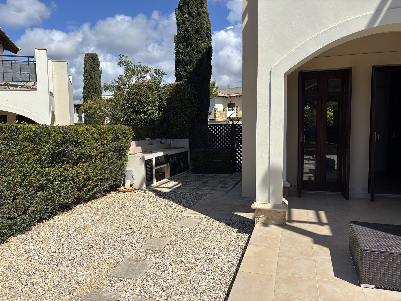 Spacious garden apartment, backing directly onto the 6 hole academy course of Aphrodite Hills Golf Course. The apartment faces south/south-south east and enjoys brilliant sunshine all day long. The generous, open plan living/dining area is central, separating the two bedrooms, allowing for comfort and privacy when you have guests. Both bedrooms have ensuite, the twin bedroom has a shower and the master bathroom, a bath with overhead shower as well as a free standing shower unit. The compact kitchen sits just off the living space with ample storage and modern appliances. French doors lead out onto a covered terrace that runs the full length of the apartment with plenty of space for a dining table and a sofa for relaxing. The large, low maintenance garden offers privacy with mature planting of local shrubs and hedging. Lots of space for sunbeds and another area for a table and chairs to enjoy the sunshine and evenings. The built in barbecue, with tiled worktop area and outdoor sink is the perfect spot to enjoy al fresco dining, long into the evenings with its own lighting. The property comes part furnished, subject to inventory.