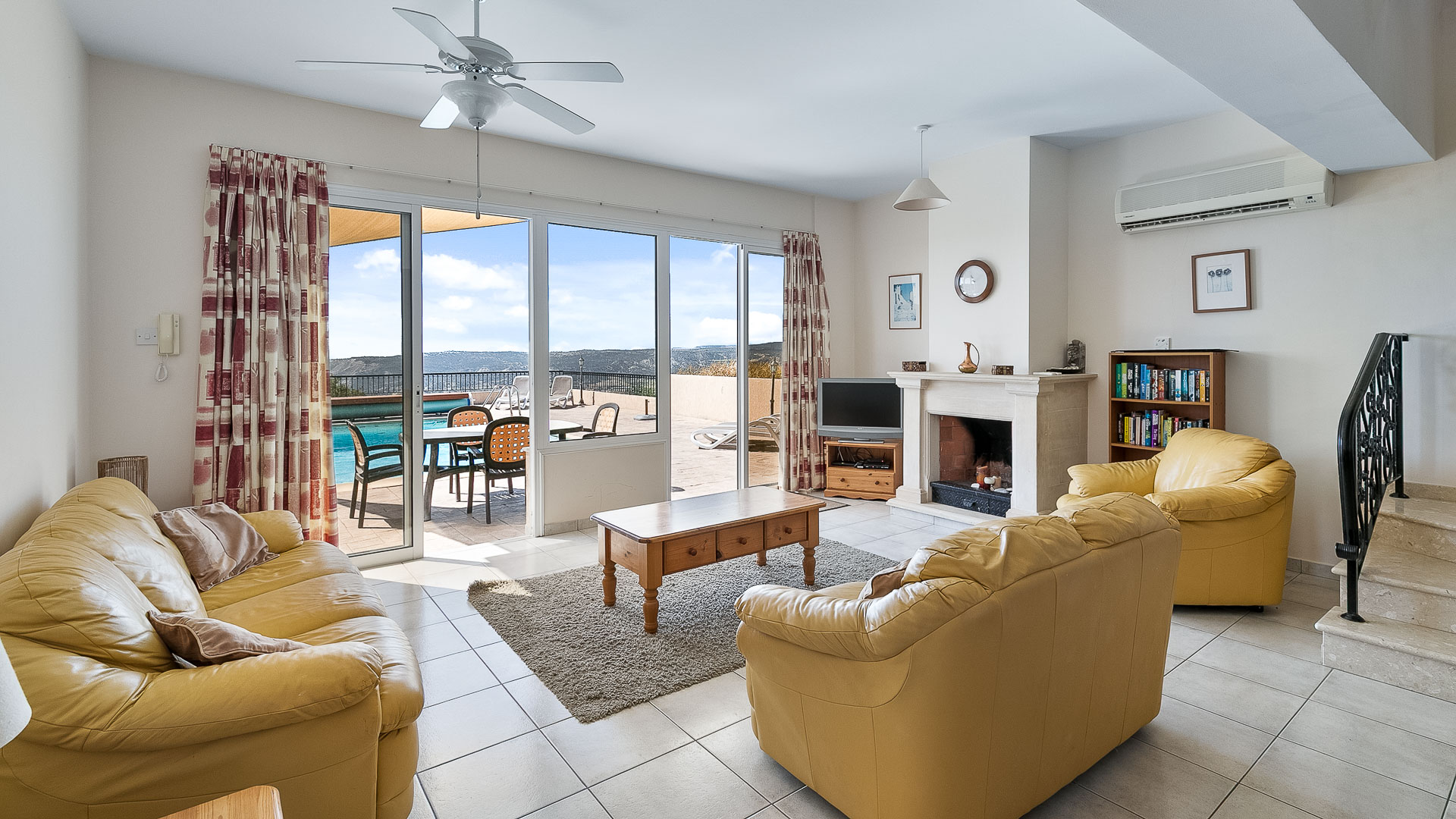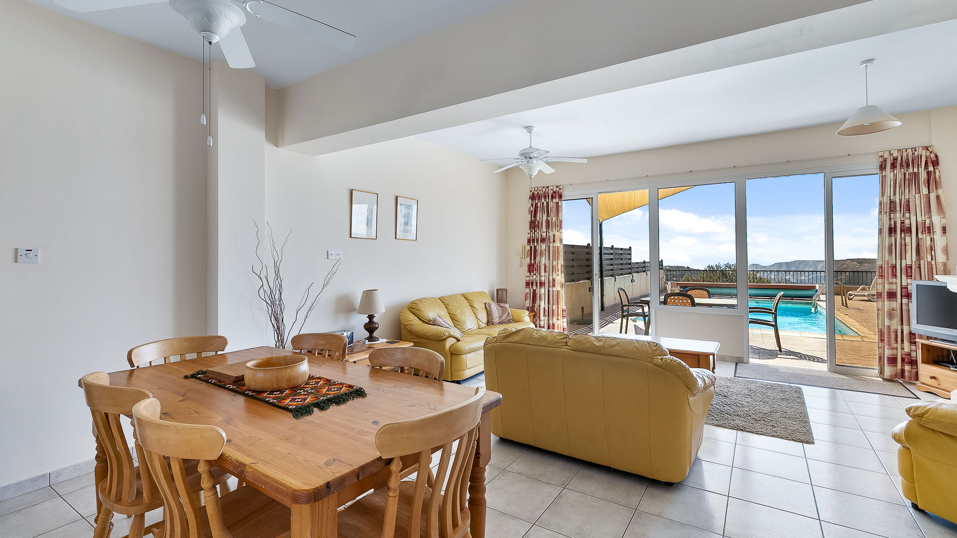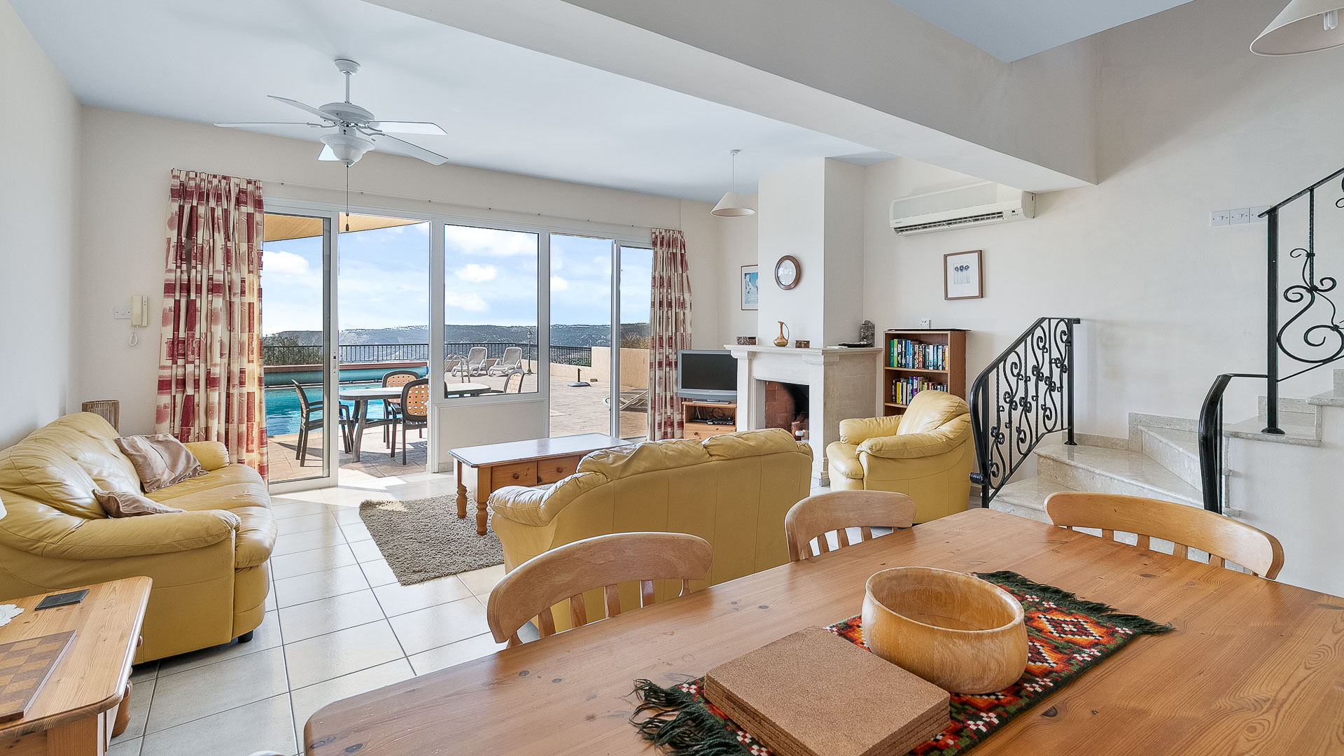 Upon entering the property there is a good sized entrance hall with a guest WC off to the right. To your left is a spacious and very well presented, fully fitted kitchen with all modern appliances opening into the living room and dining room which are bright, spacious and magnificently light, having twin, large patio doors out to a terrace overlooking the pool and the stunning views. A stone fireplace is a feature of this spacious room.