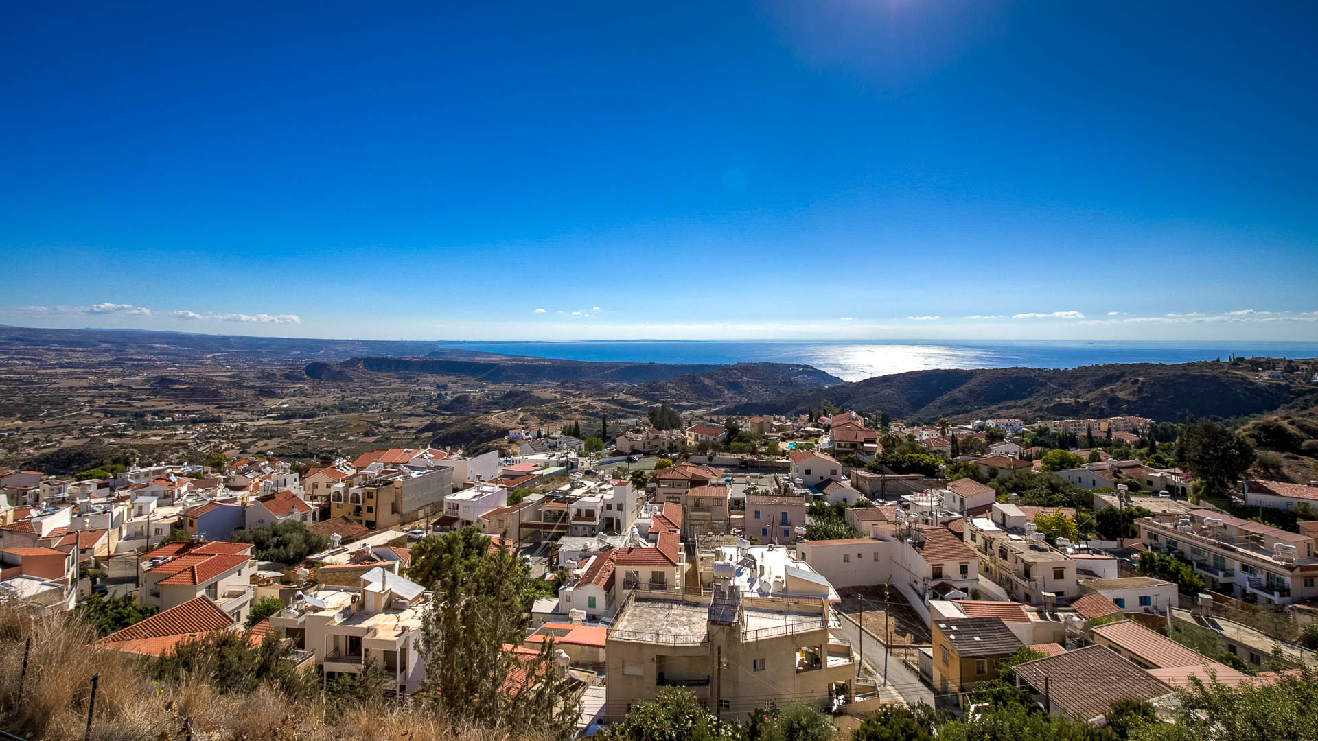 The main PISSOURI VILLAGE is located about 3kms from the sea on the Cape Aspro ridge, and about 500 feet above sea level (152m ). Pissouri is the third largest village district in the Limassol district of Cyprus, and is located just off the A6 motorway midway between Limassol and Paphos (34 kms from each) in the Southwest of Cyprus. It is the administrative centre for the Pissouri District, and boasts a village square, 2 petrol stations, police station, post office, supermarkets, and two clinics. There are many charming tavernas and coffee shops, and also entertainment facilities, a magnificent Gothic church, and several chapels. The village is home to the majority of the friendly Cypriot population of Pissouri, but also has a large ex-patriot population.