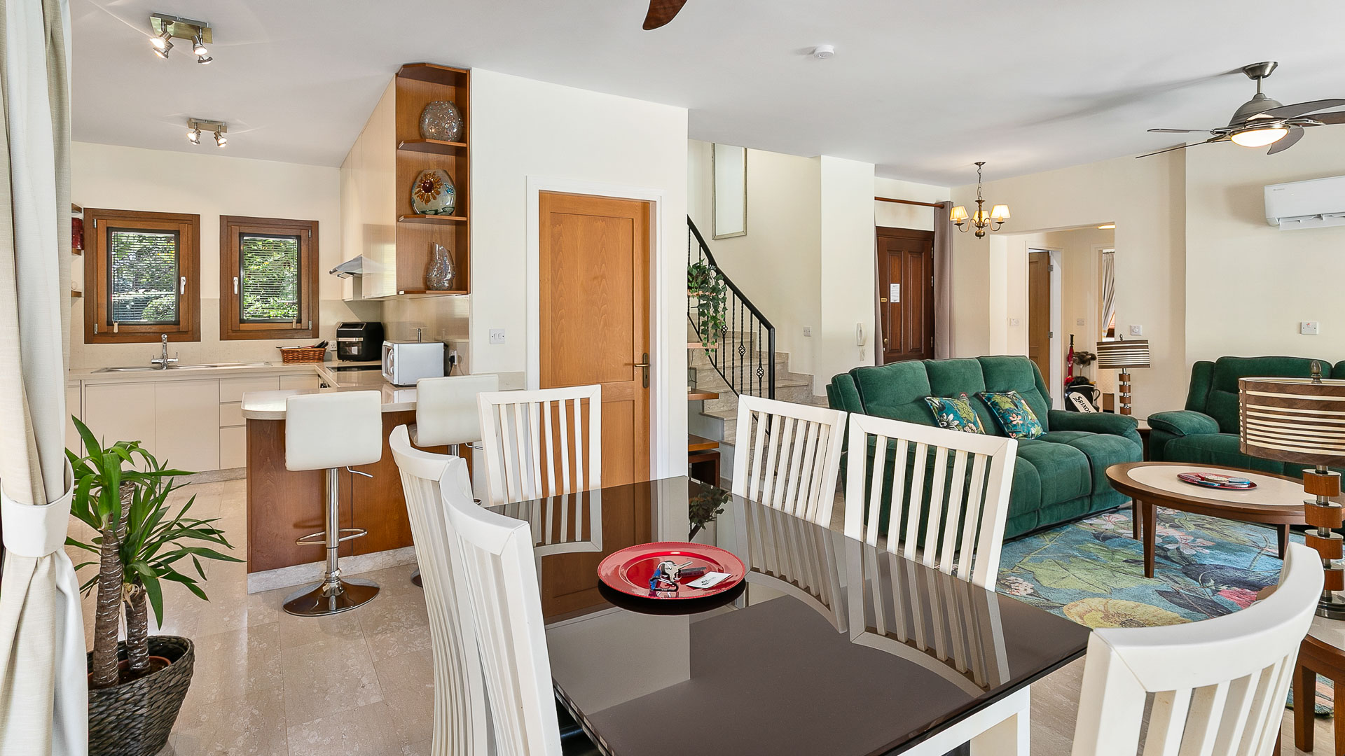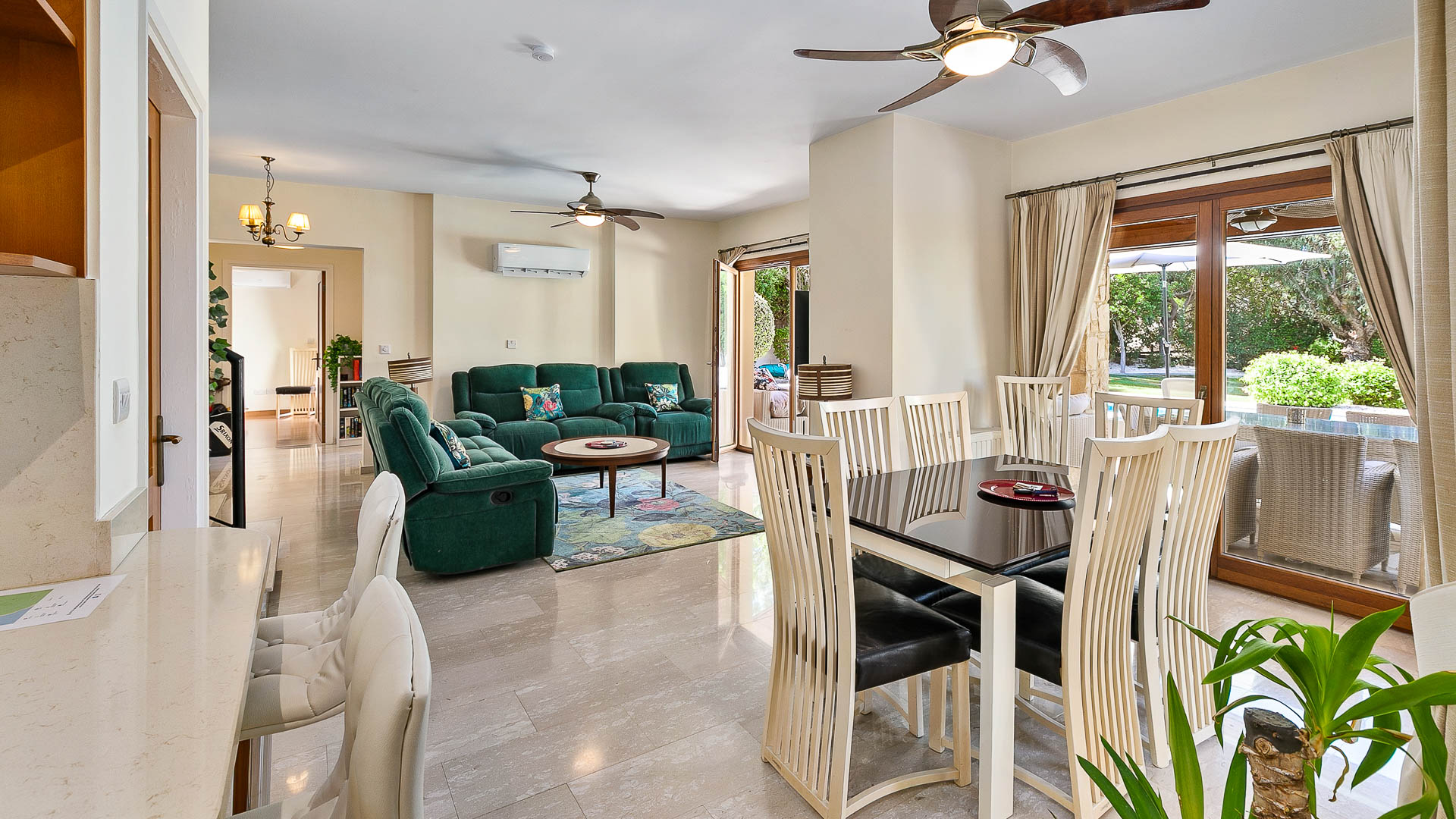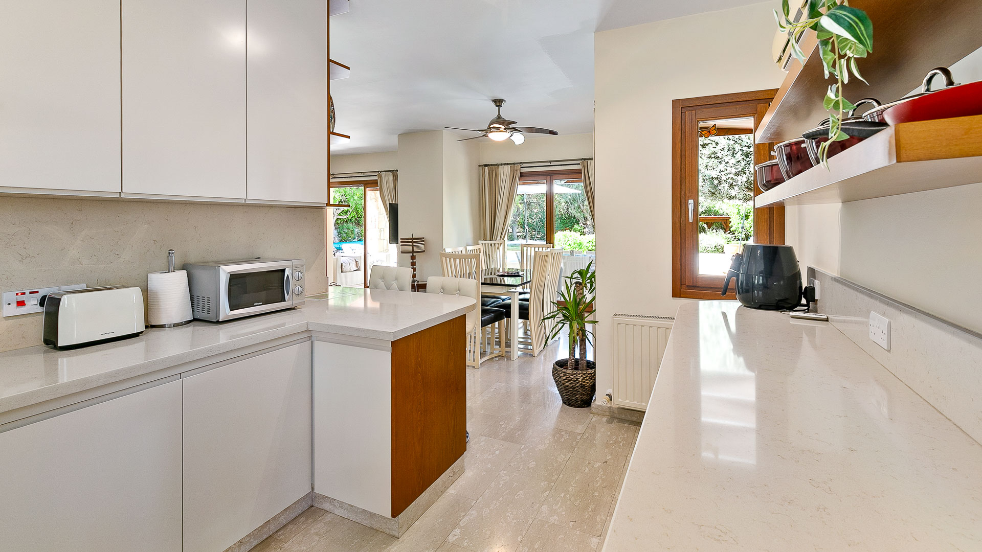 As you walk down the path in the midst of the beautiful terraced landscaped gardens and through the front door, there is an open plan living room and dining area with patio doors looking out onto the poolside terrace area, the pool and exquisite rear gardens.