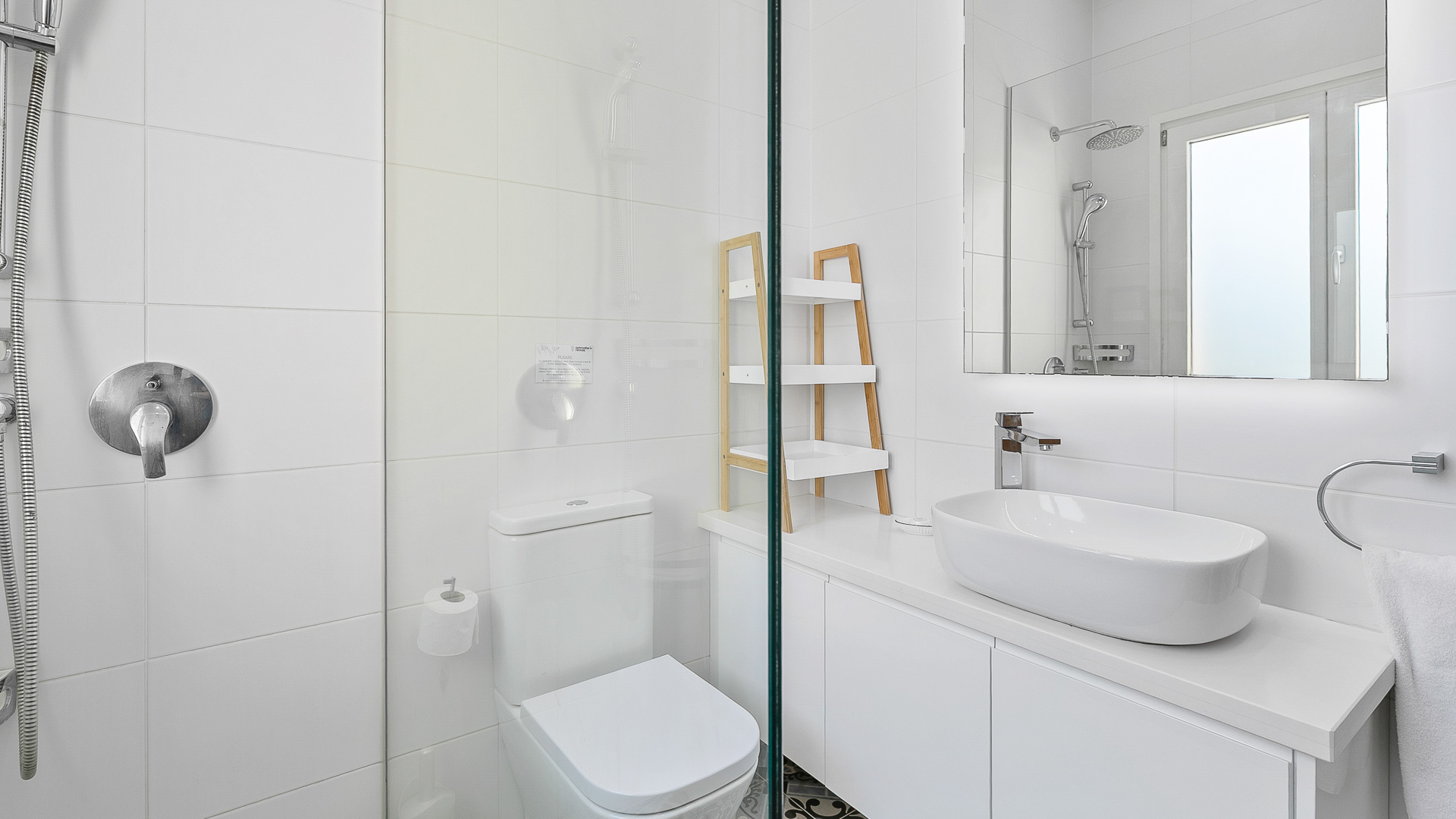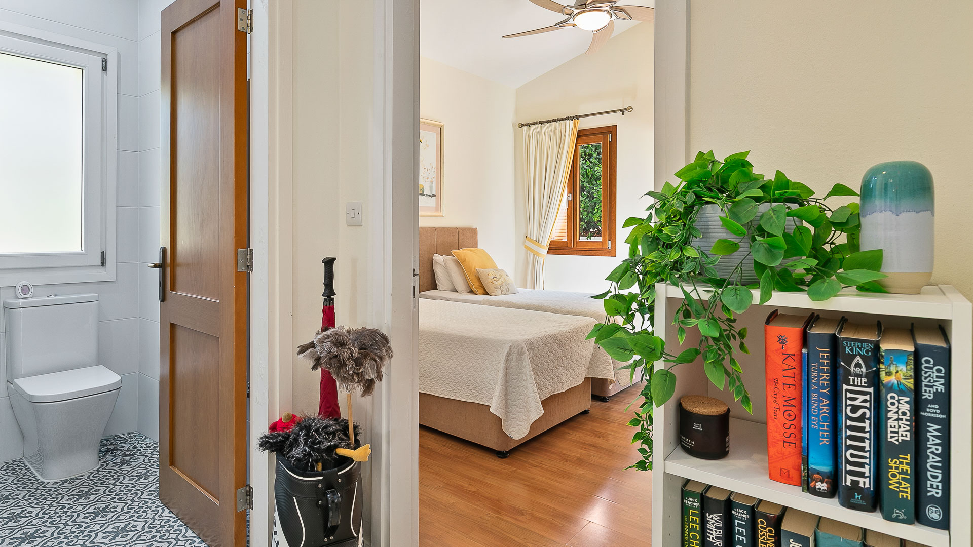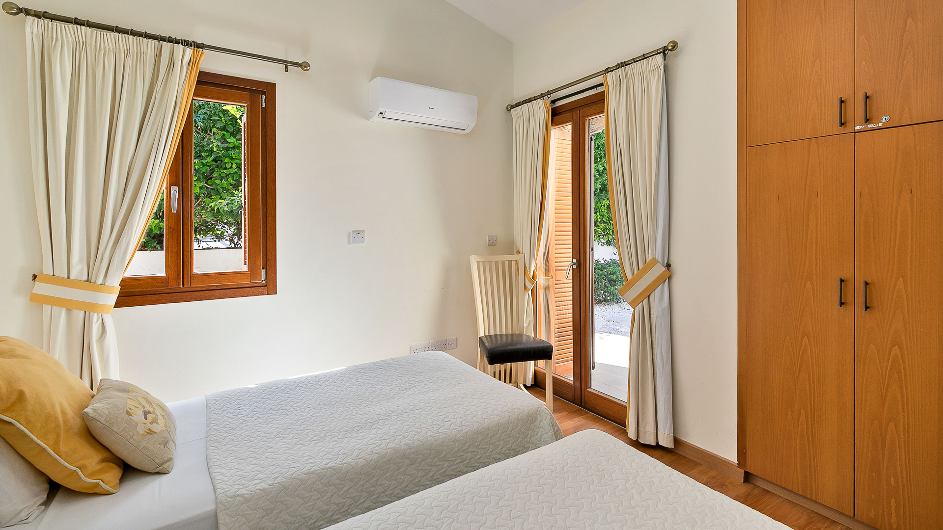 The first double and twin bedrooms are both located on the ground floor level, are spacious and both have patio doors that open out to the outside terrace and garden. These bedrooms share a bathroom with a walk-in shower.