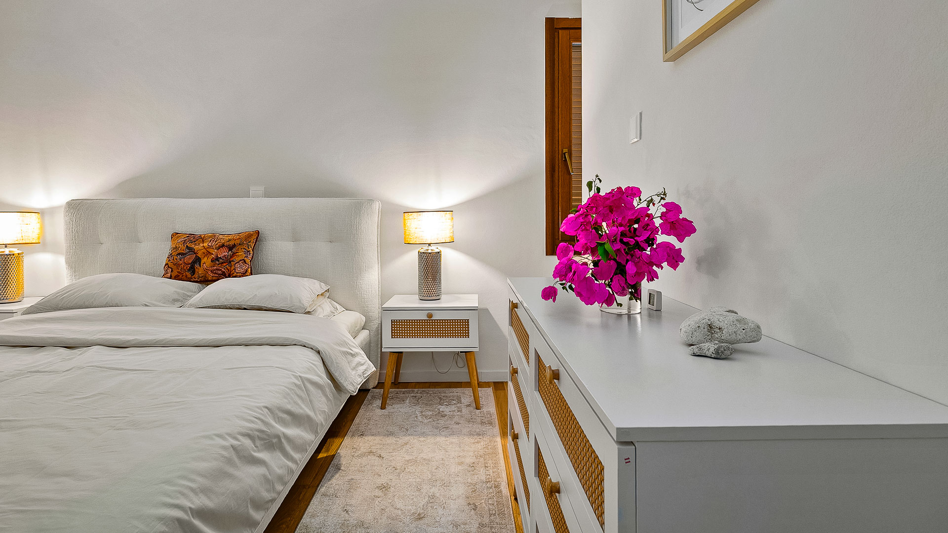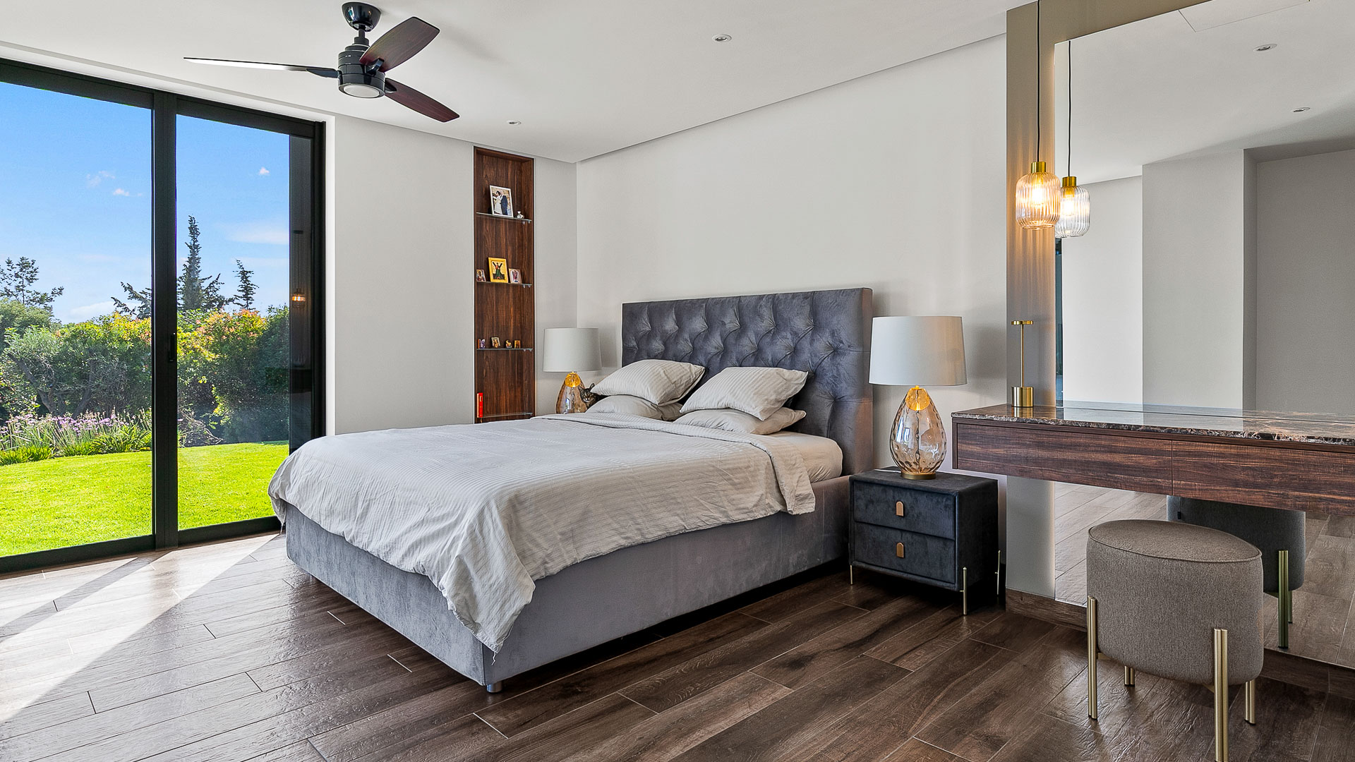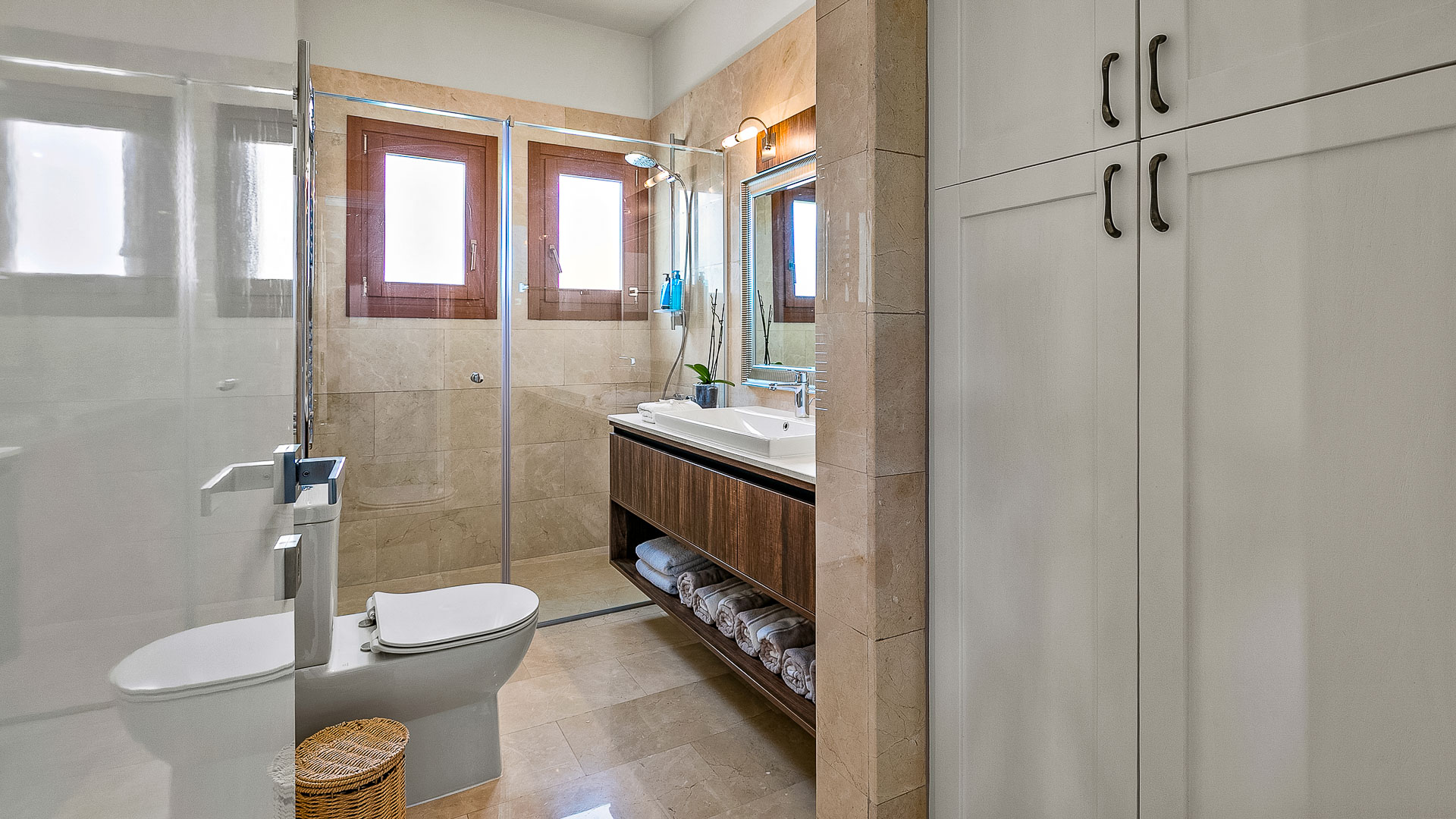 This unique Villa offers a modern twist to Mediterranean living. Set on one level, with its contemporary design and extra thought into the detail including ambient lighting, concealed air-conditioning and underfloor heating. The stunning kitchen with its breakfast bar and the open plan lounge/dining area, with its living fire add an extra bit of luxury. The villa has four double bedrooms and four opulent bathrooms. One of which has a free standing oval shaped bath, with its subtle lighting and a view through glass doors onto a covered balcony, creating an oasis of calm. The master bedroom has a walk-in wardrobe and sliding doors lead out onto the pool and garden areas.