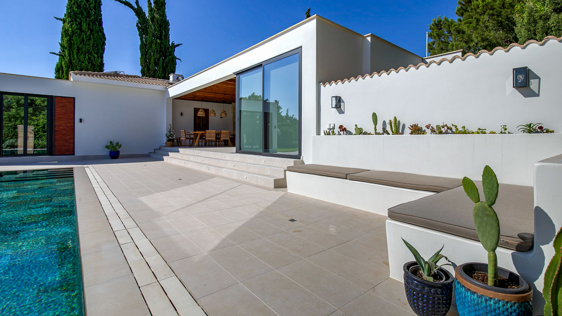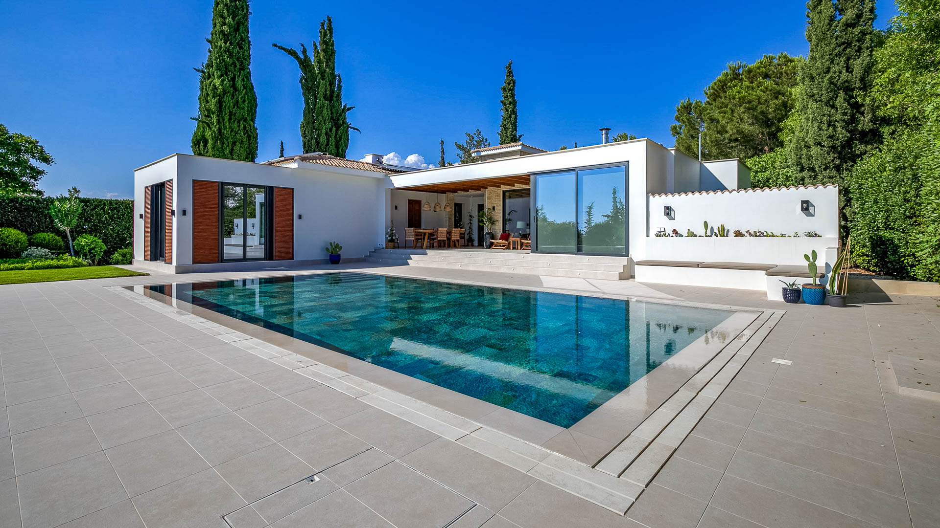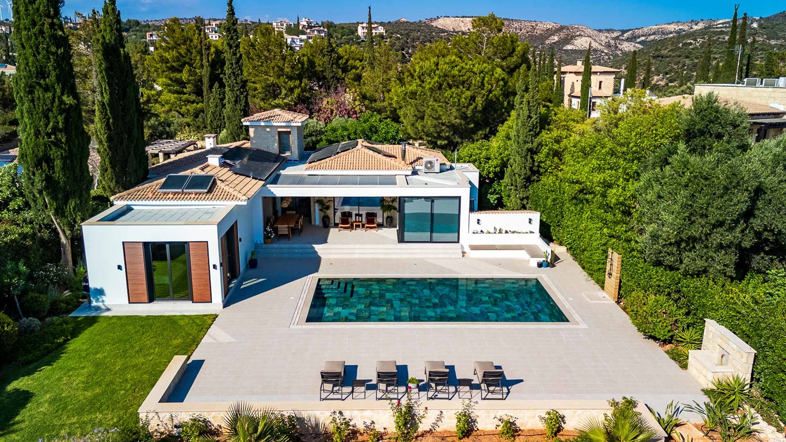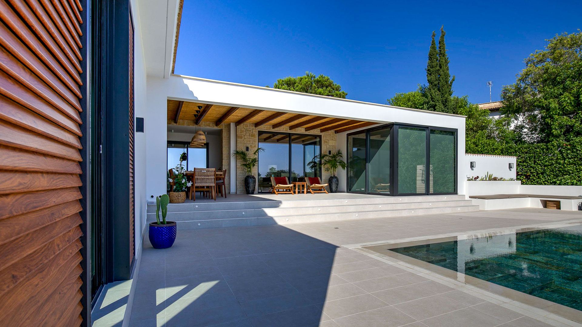 The villa has large floor-to-ceiling windows and sliding doors that lead to the 10x5m private pool, a shaded lounge area and a large terrace with views to the Mediterranean Sea.