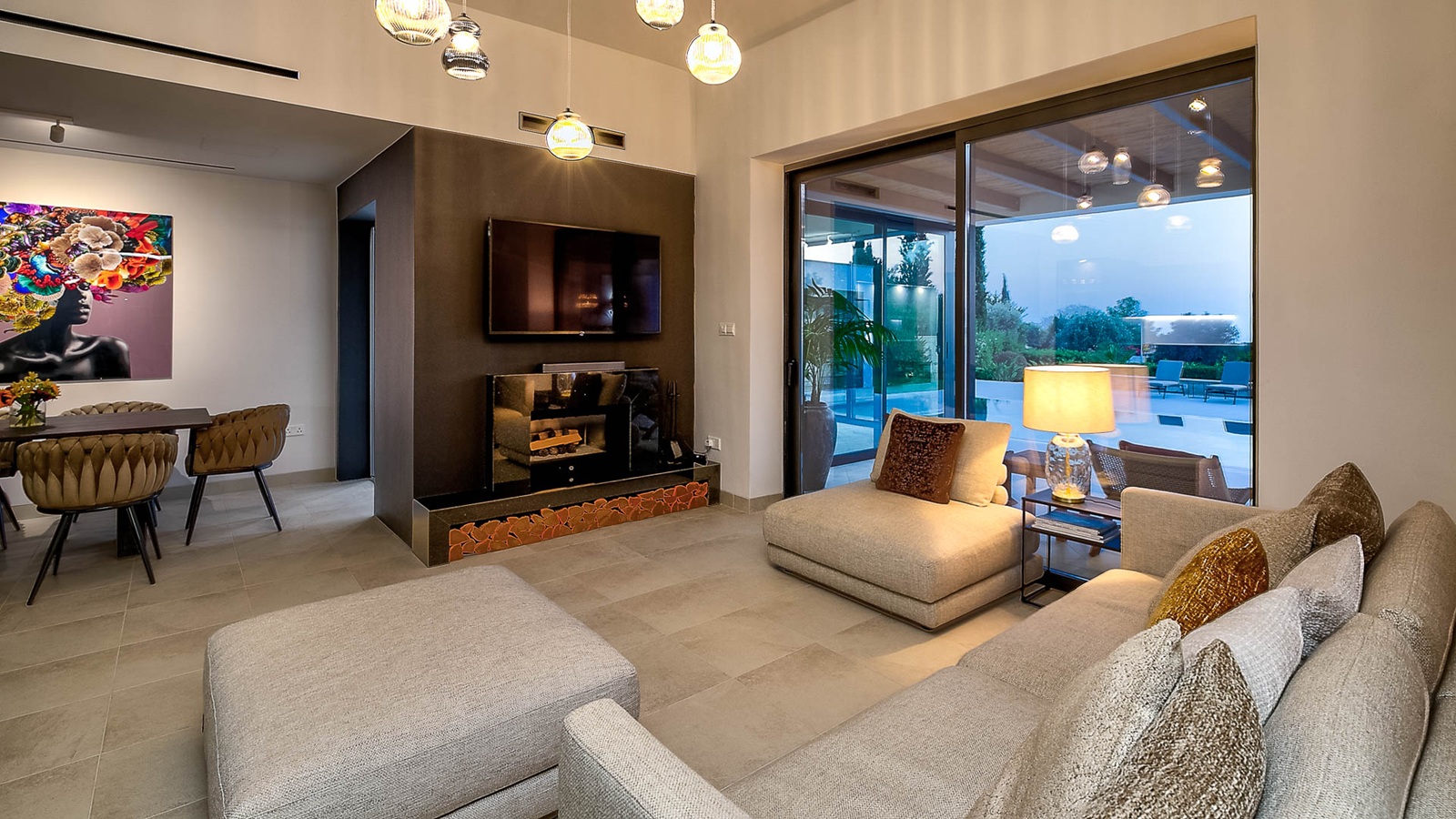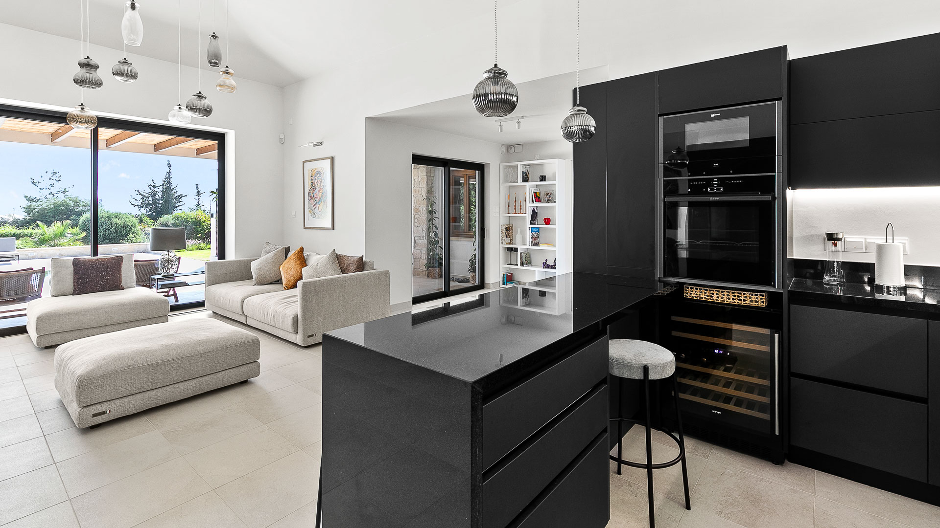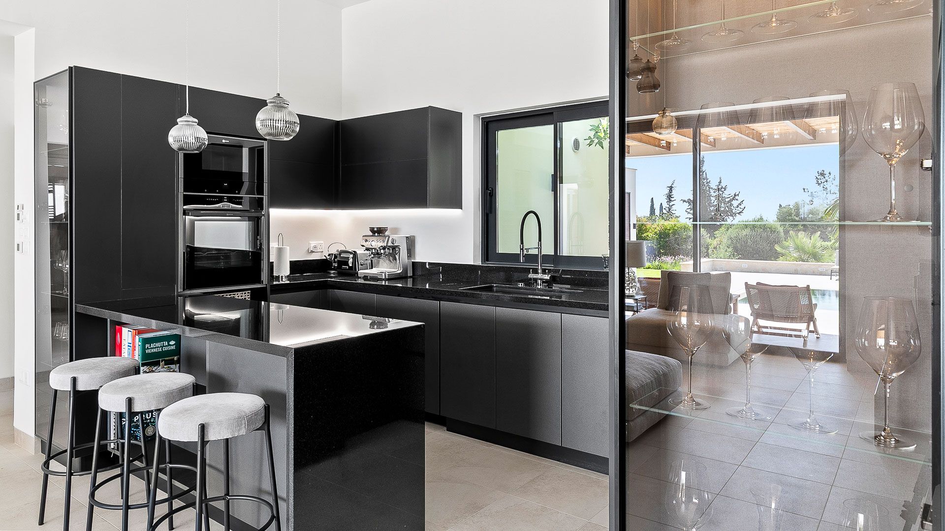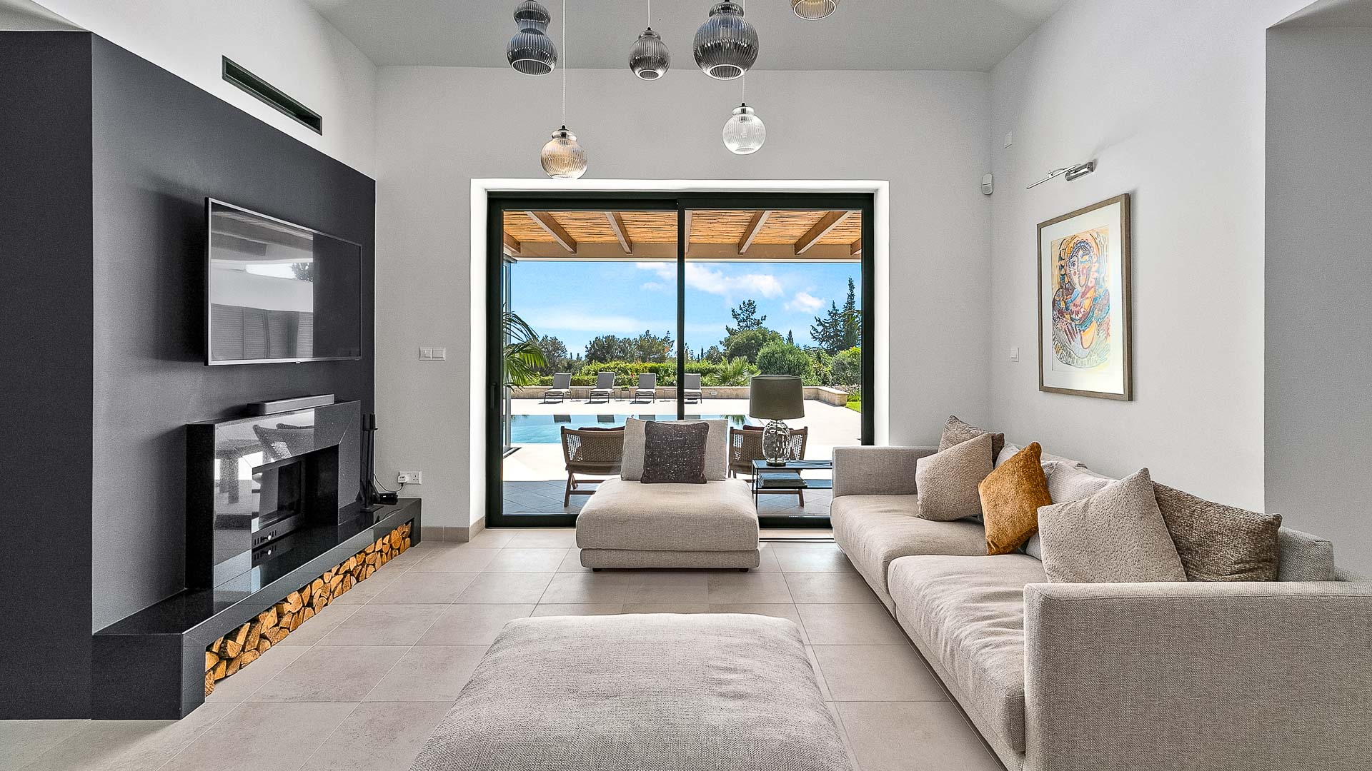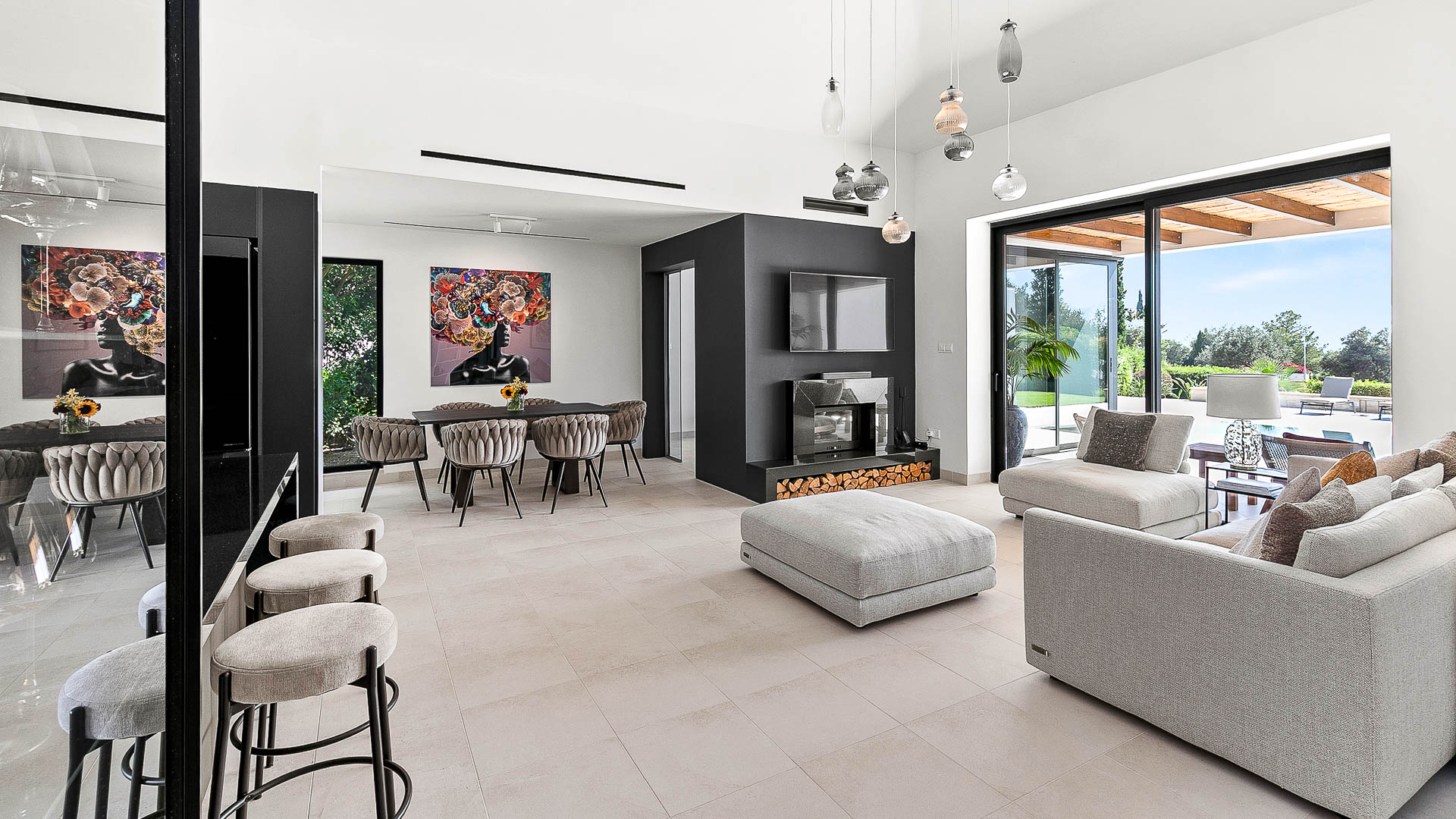 The villa has large floor-to-ceiling windows and sliding doors that lead to the 10x5m private pool, a shaded lounge area and a large terrace with views to the Mediterranean Sea.