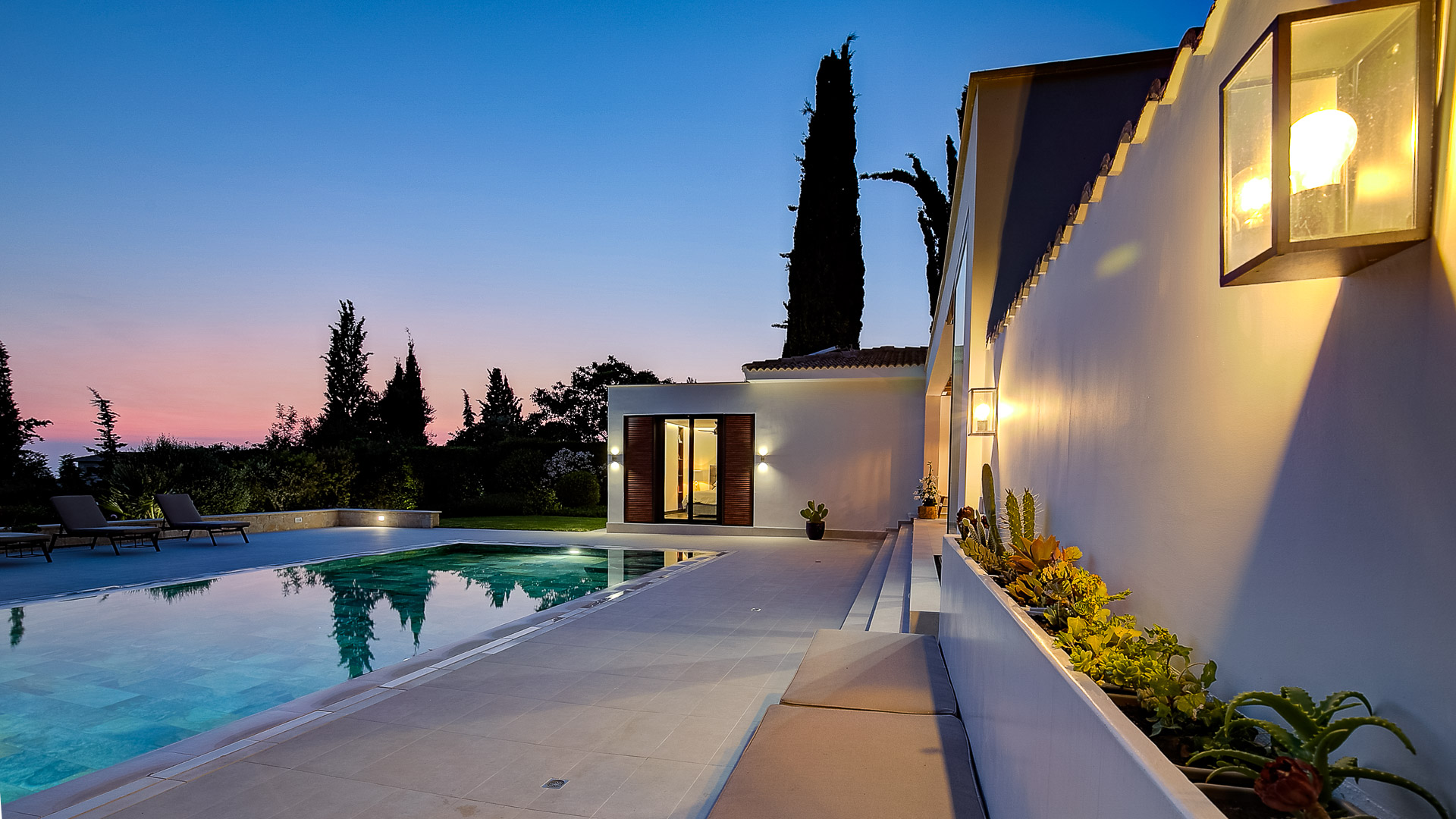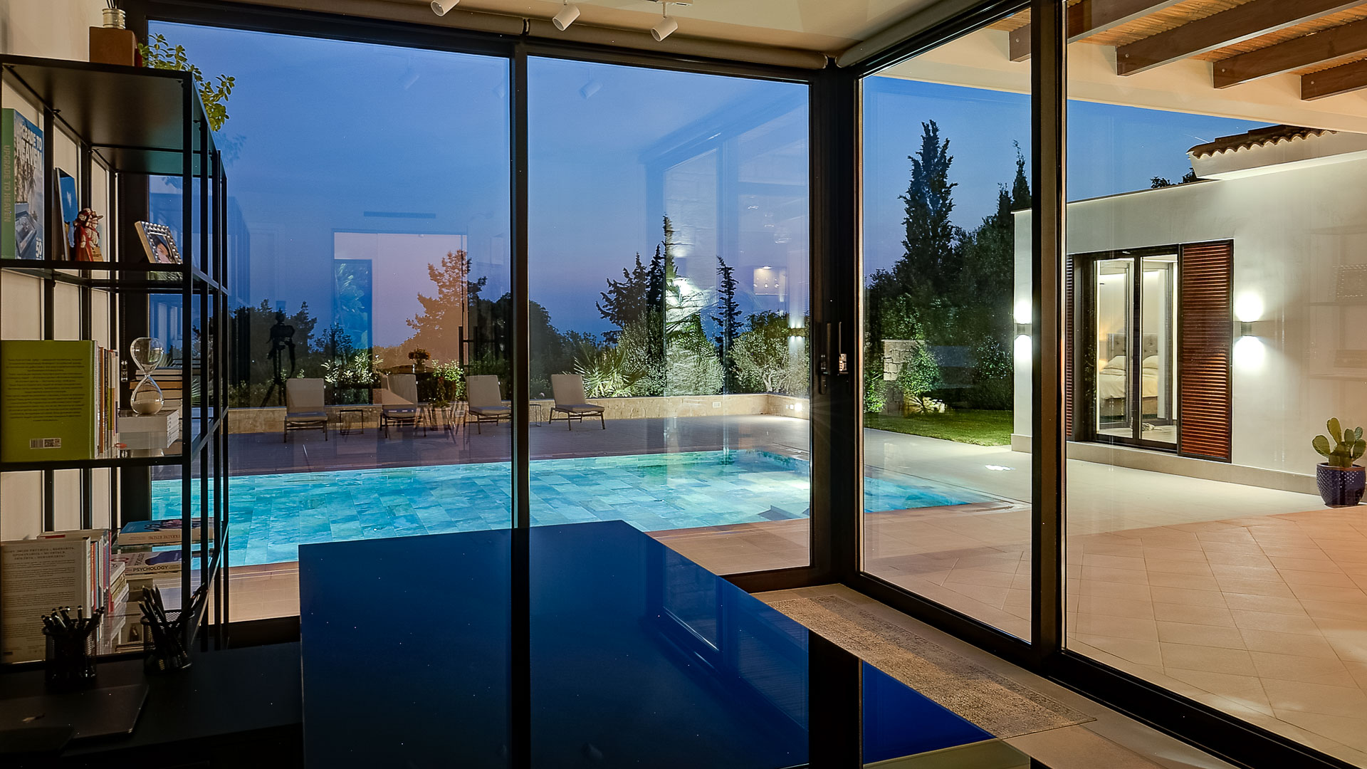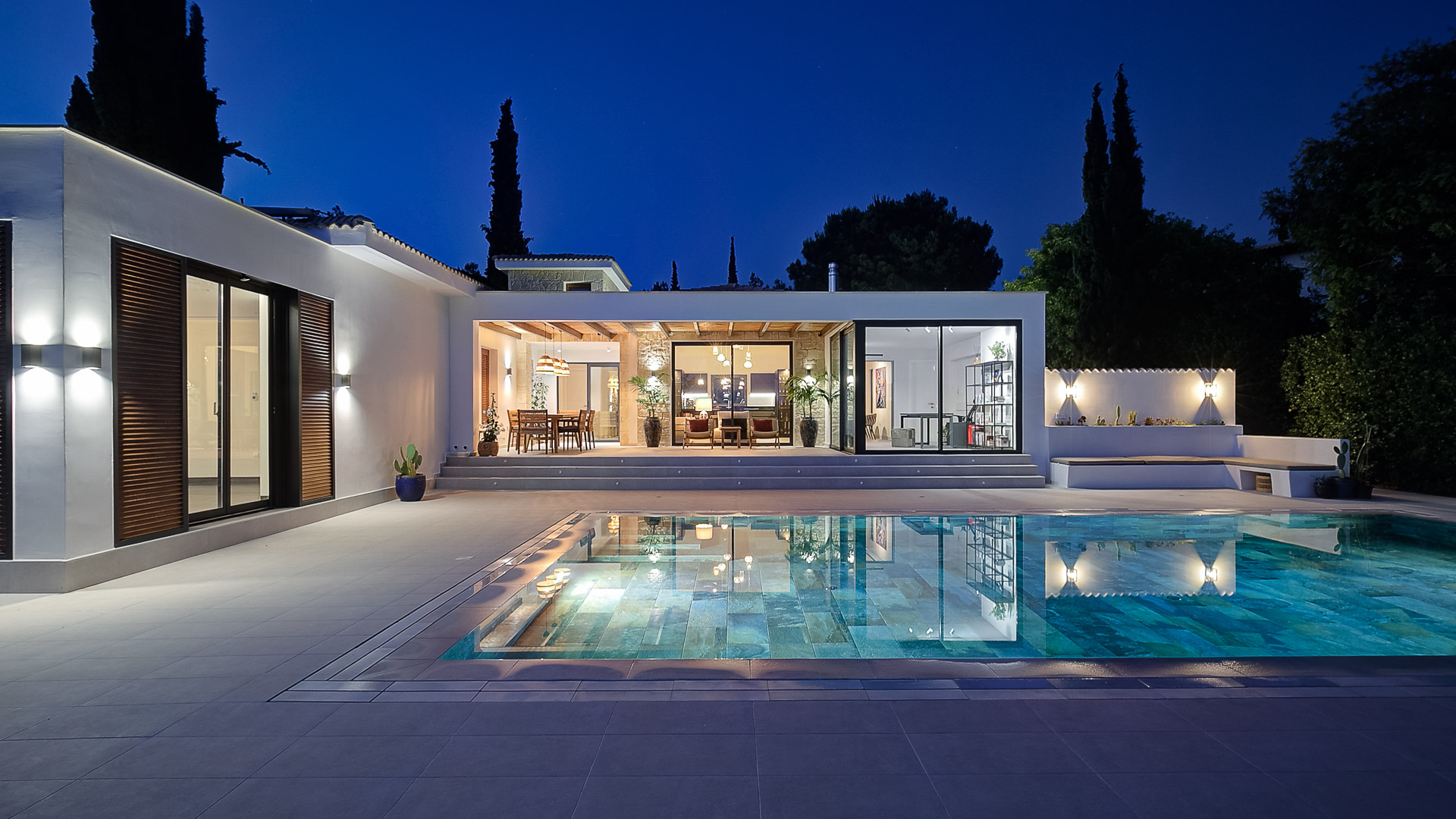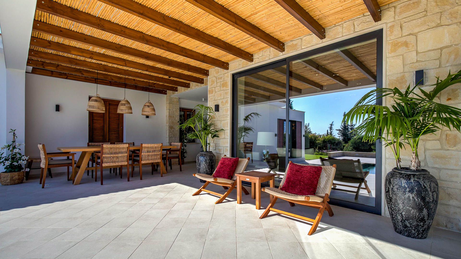 The villa has large floor-to-ceiling windows and sliding doors that lead to the 10x5m private pool, a shaded lounge area and a large terrace with views to the Mediterranean Sea.