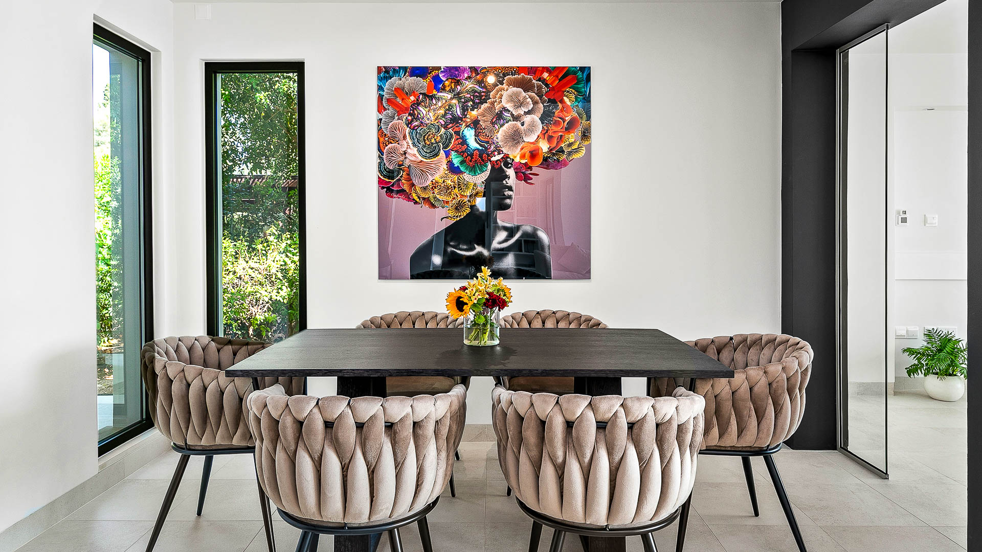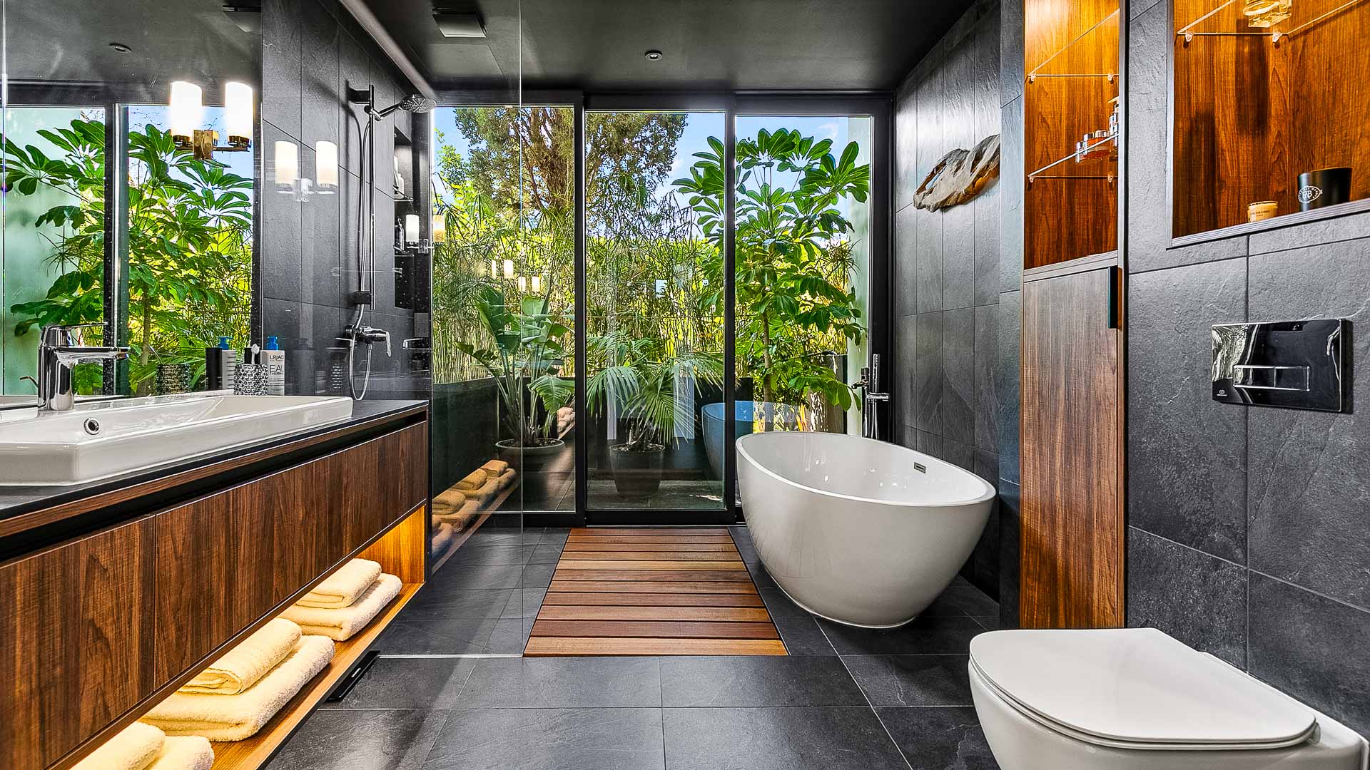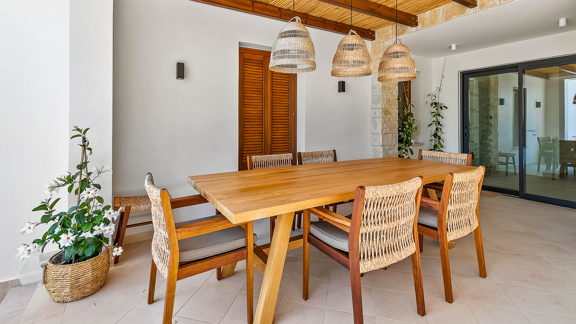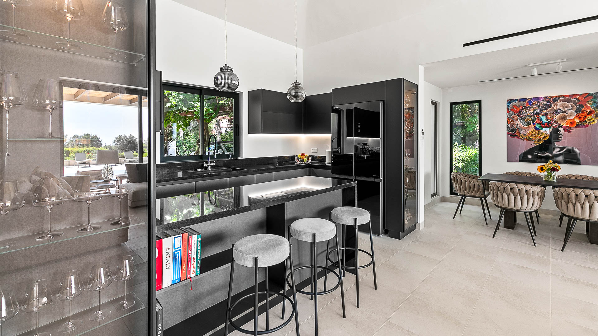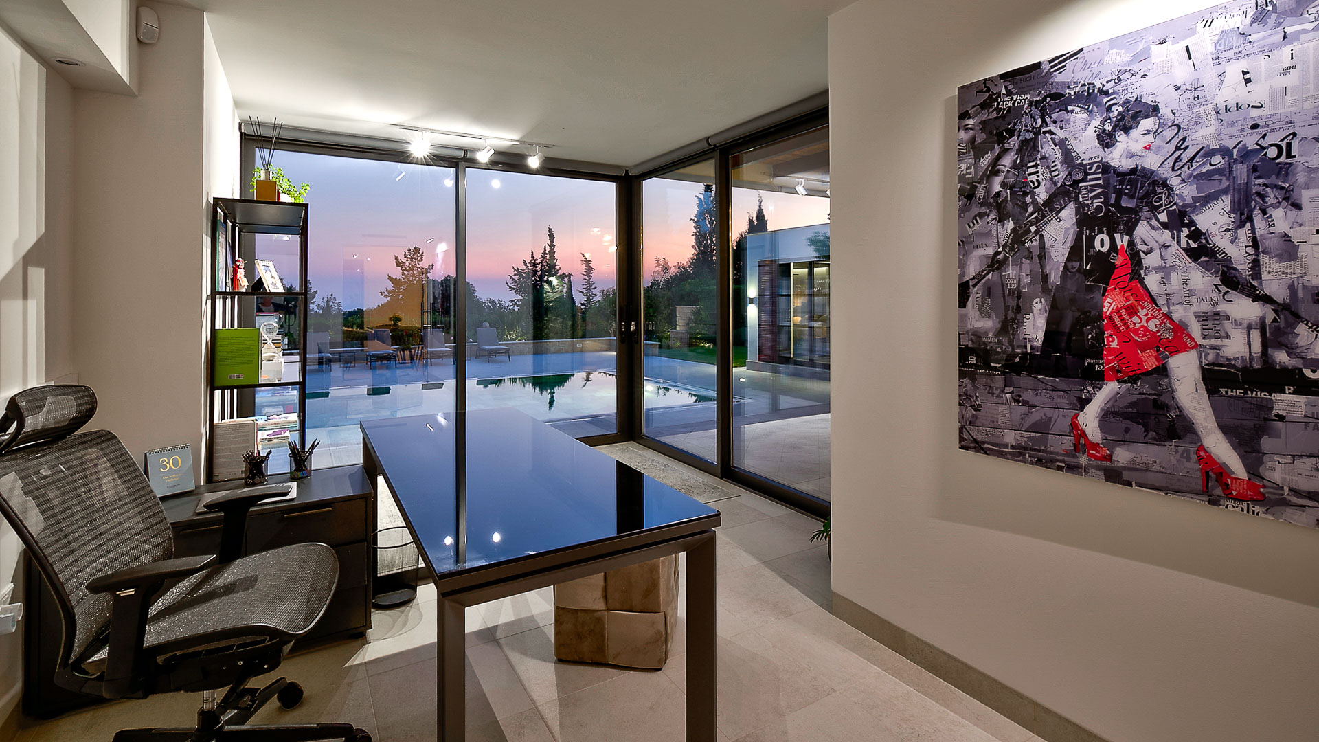 The villa has large floor-to-ceiling windows and sliding doors that lead to the 10x5m private pool, a shaded lounge area and a large terrace with views to the Mediterranean Sea.