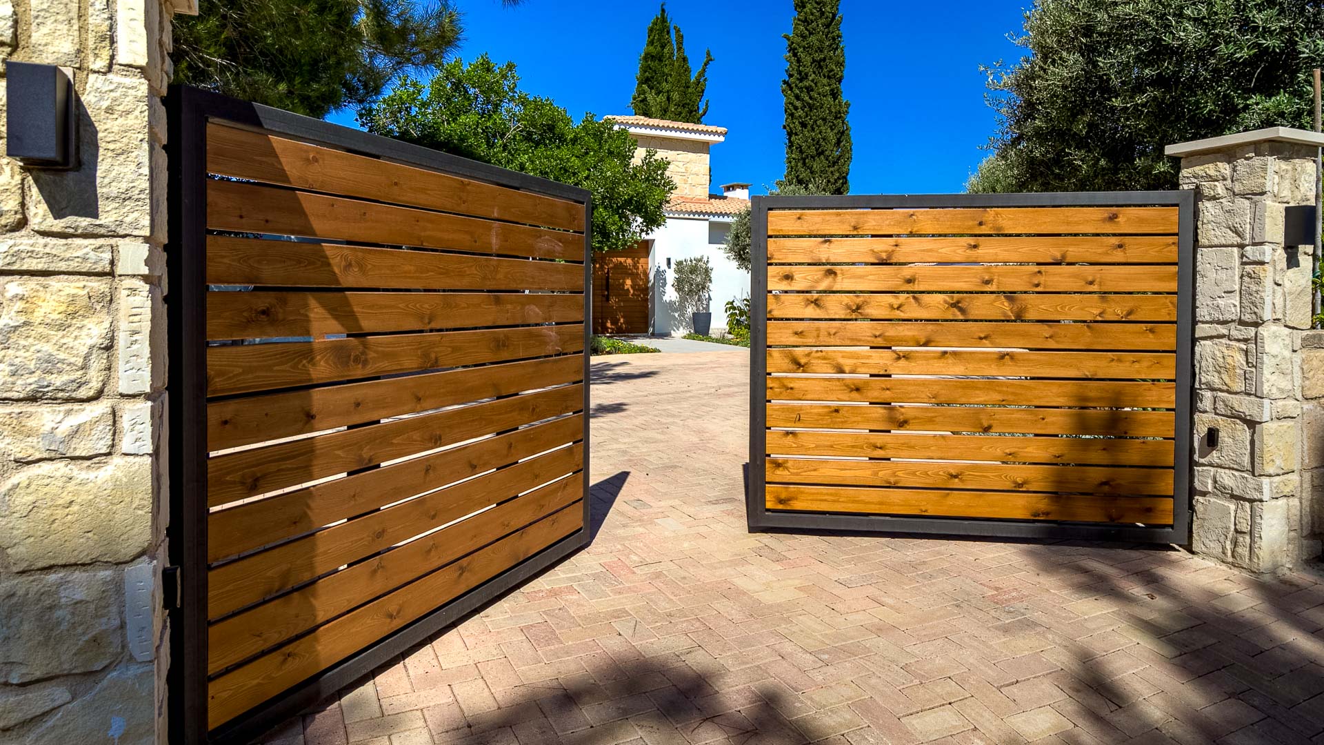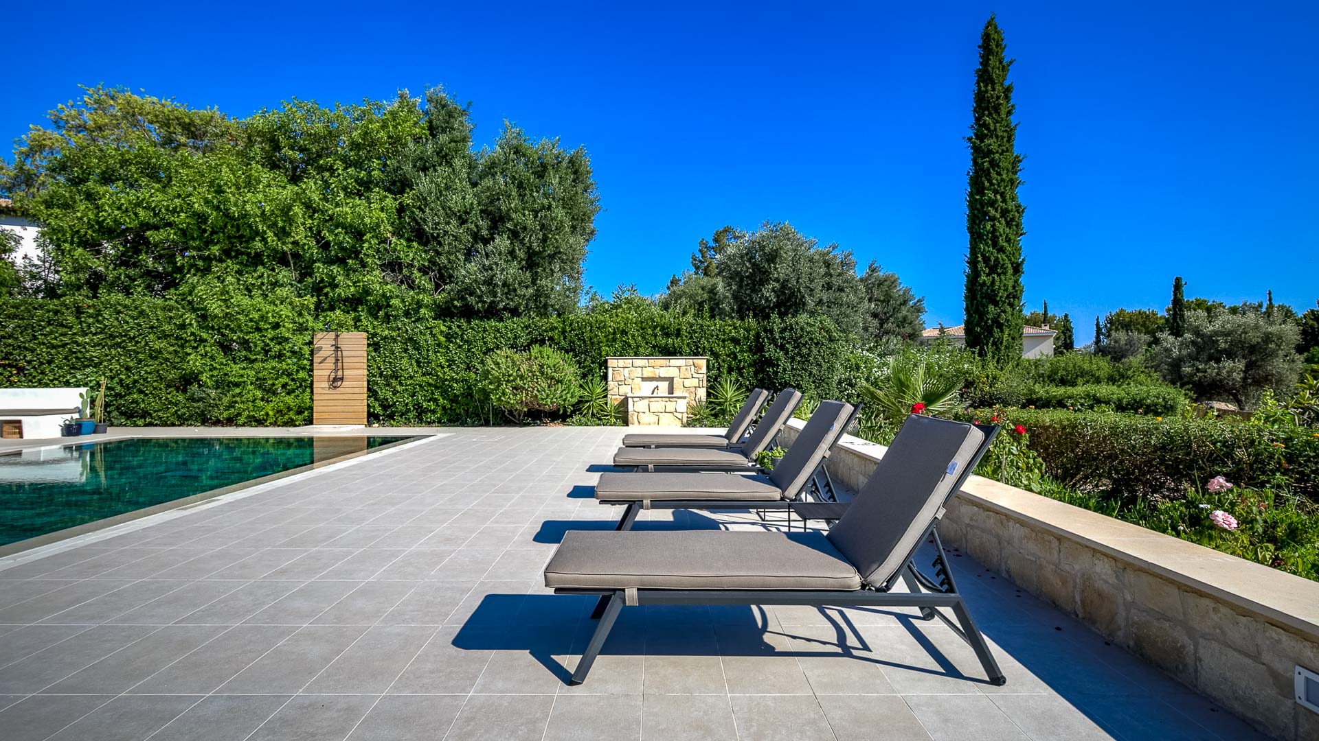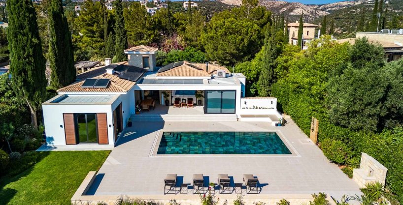 Set amongst mature landscaped gardens and tall bay-leaf hedges, this beautifully renovated Villa, enjoys complete privacy, in a quiet cul-de-sac on the Eastern plateau, of the award winning Aphrodite Hills Resort. One approaches the villa through automatic gates along its own private driveway. There are parking spaces for two cars.