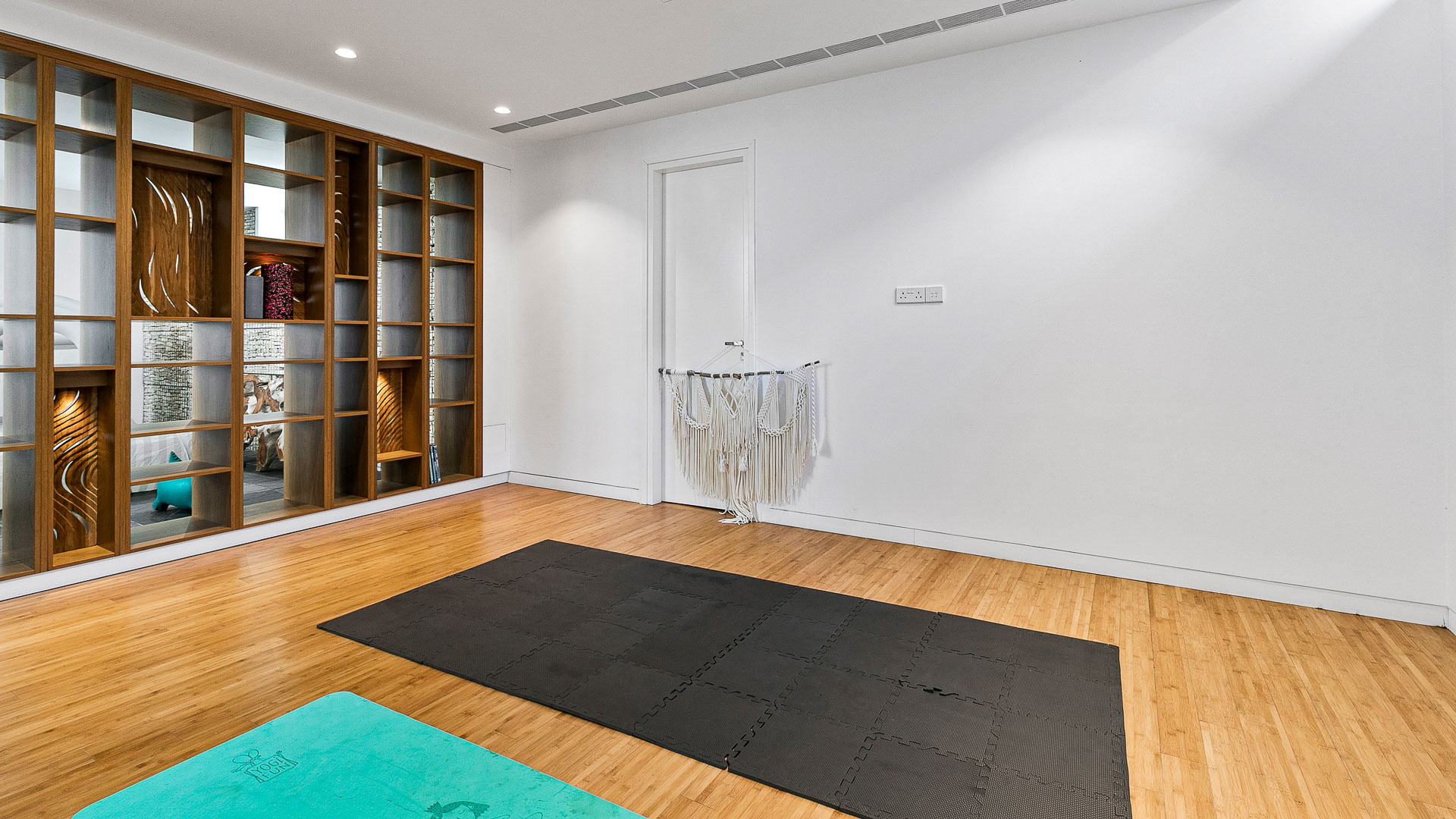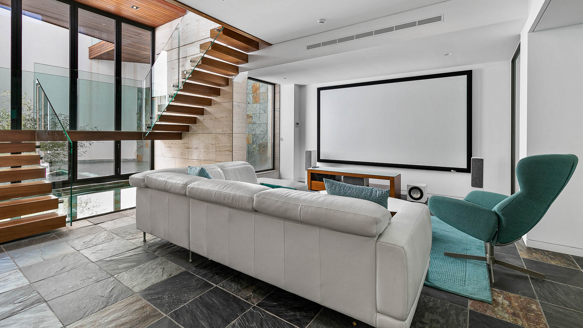 Down the beautifully crafted floating staircase, you have a further two double bedrooms and a separate studio apartment. The ample living space is currently a cinema room, with adjacent wine cellar and Gym room.