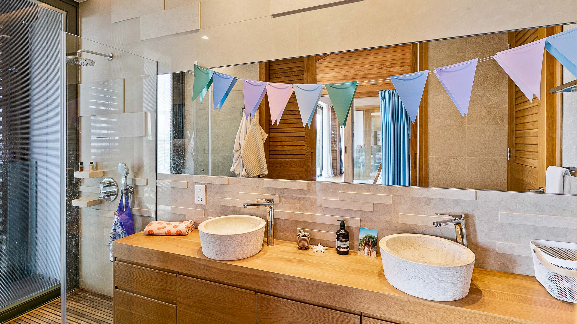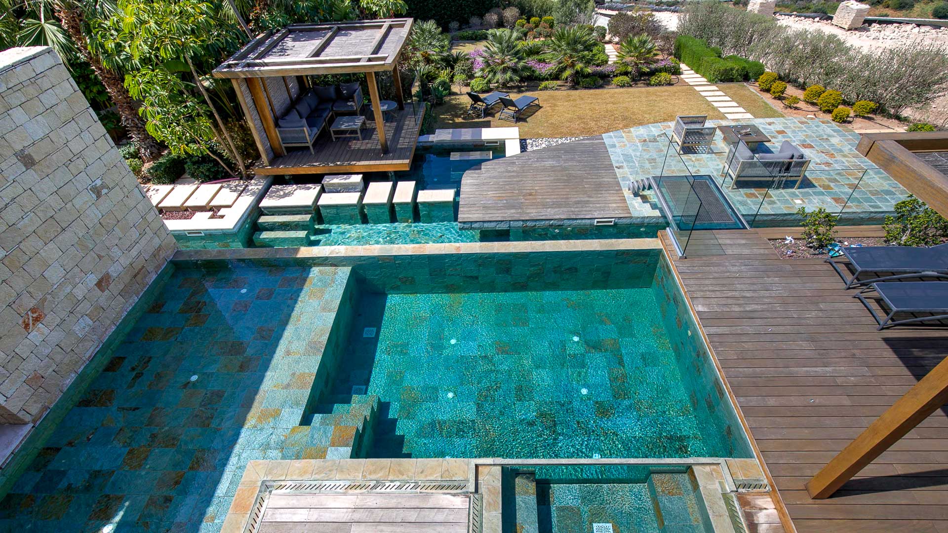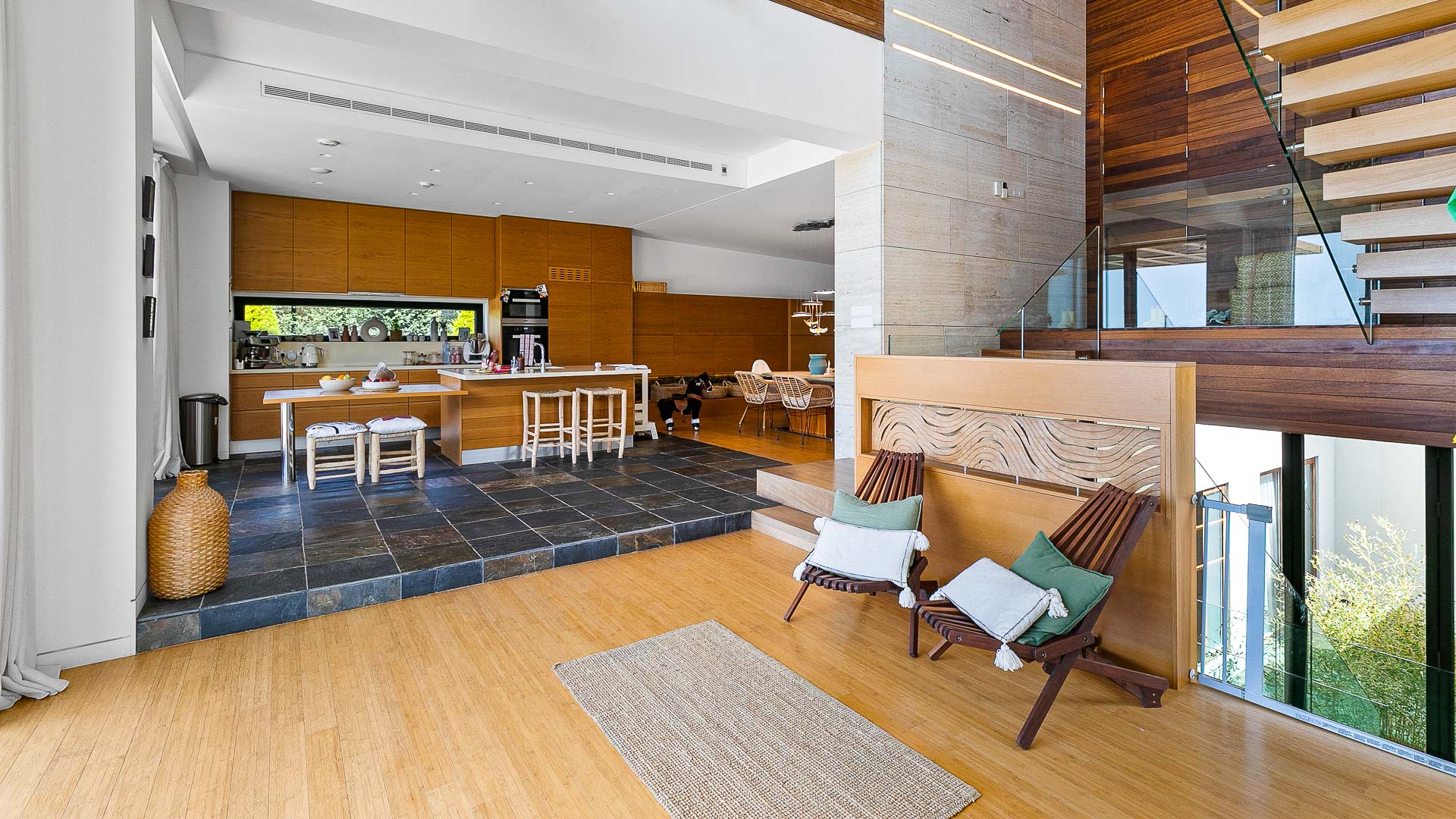 There are eight separate water features that beautifully blend the internal and external spaces with a sense of calmness. The two master bedrooms on the first floor have floor to ceiling bi-fold windows which allow for stunning panoramic views. The en-suite bathrooms have slate floors and marble walls and an indoor/outdoor walk-in rain shower with teak floor.