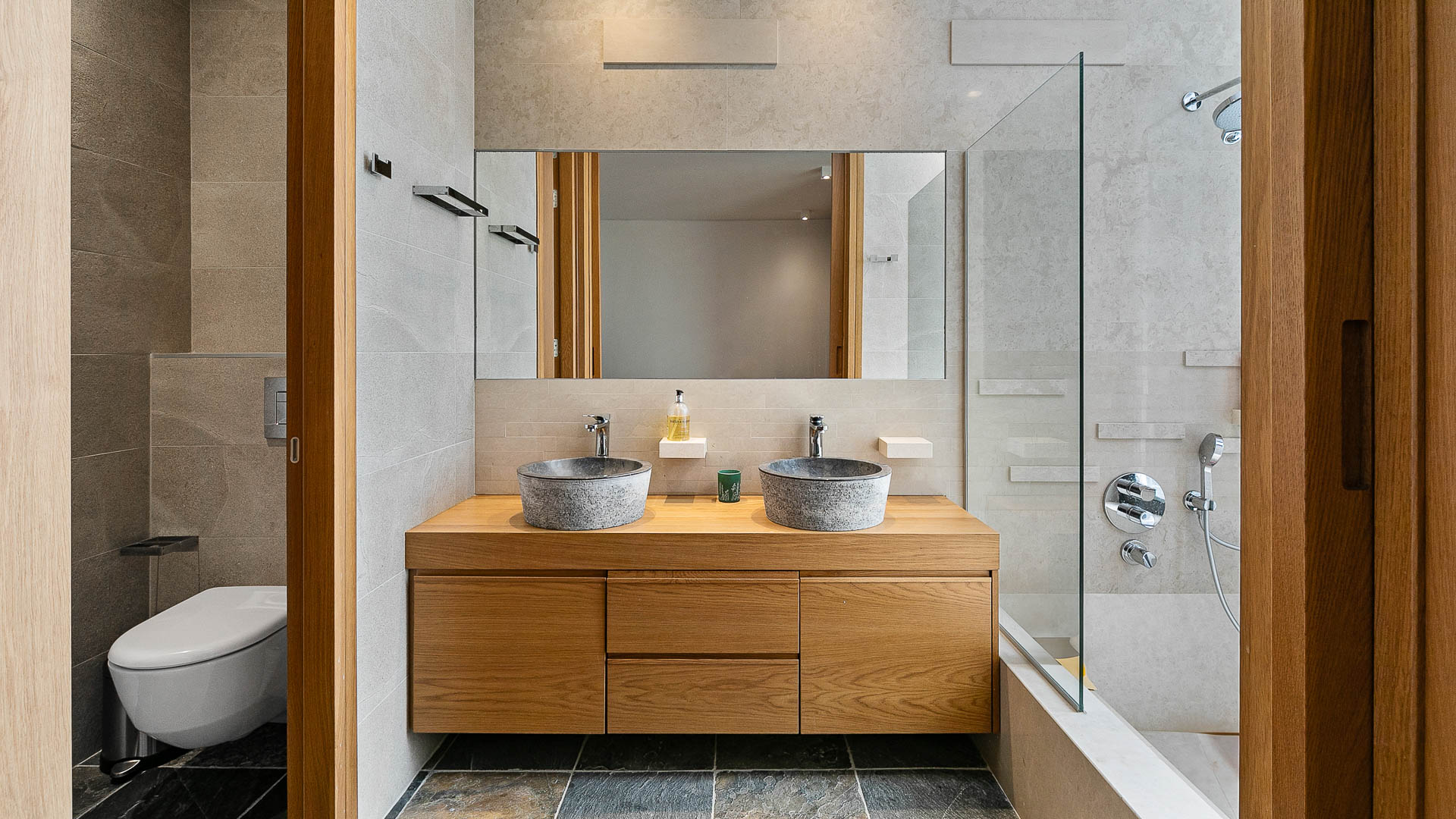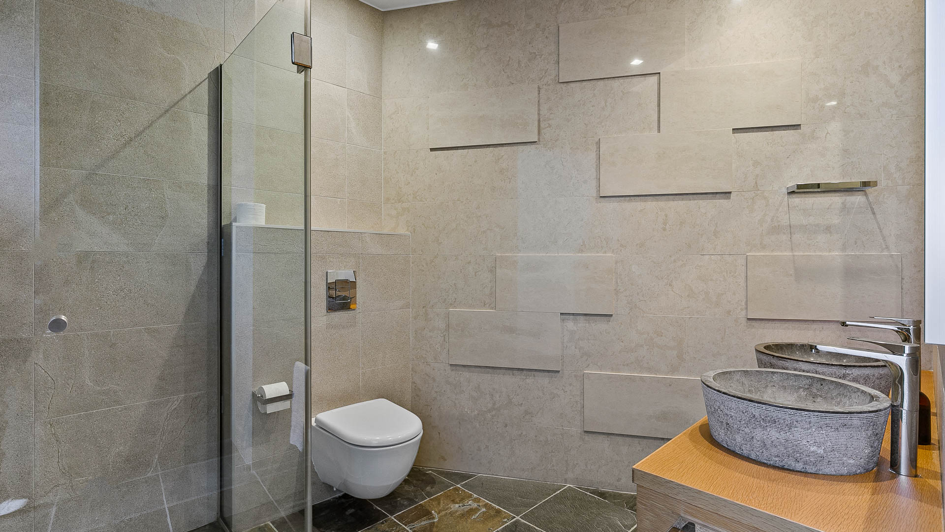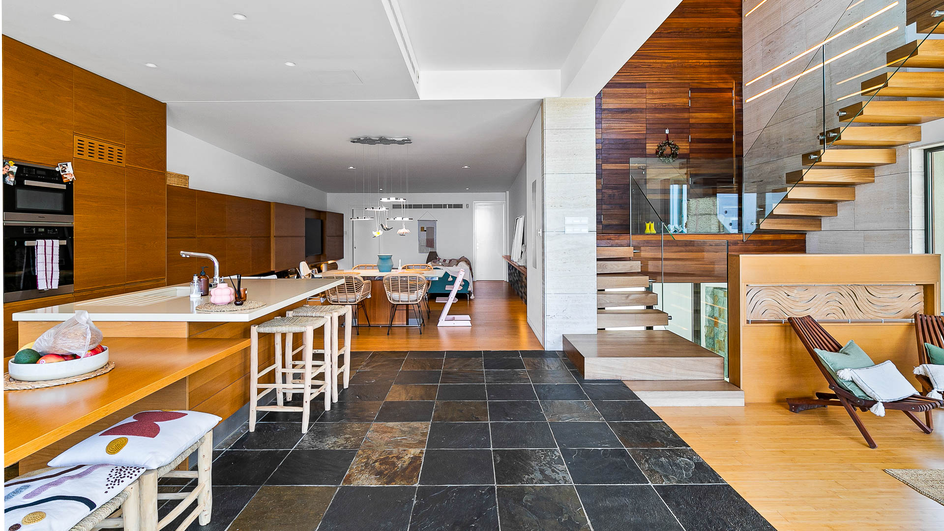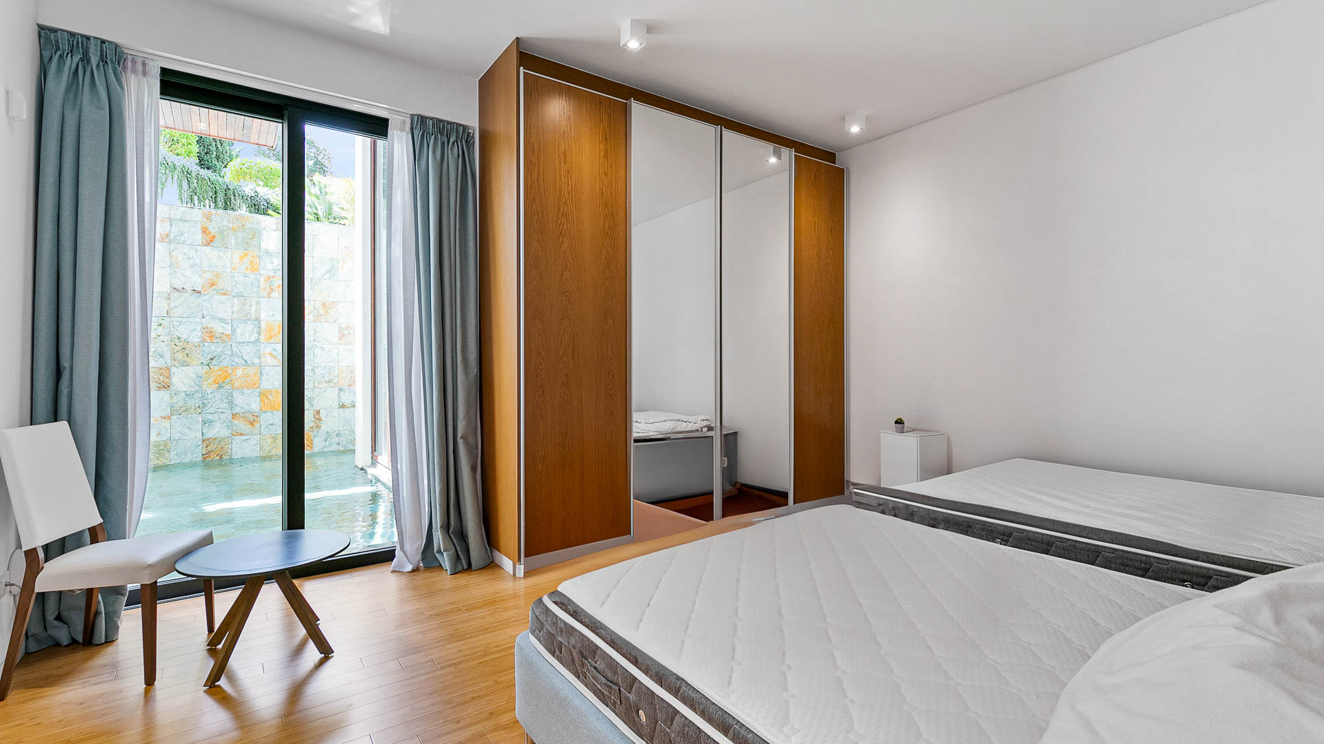 There are eight separate water features that beautifully blend the internal and external spaces with a sense of calmness. The two master bedrooms on the first floor have floor to ceiling bi-fold windows which allow for stunning panoramic views. The en-suite bathrooms have slate floors and marble walls and an indoor/outdoor walk-in rain shower with teak floor.