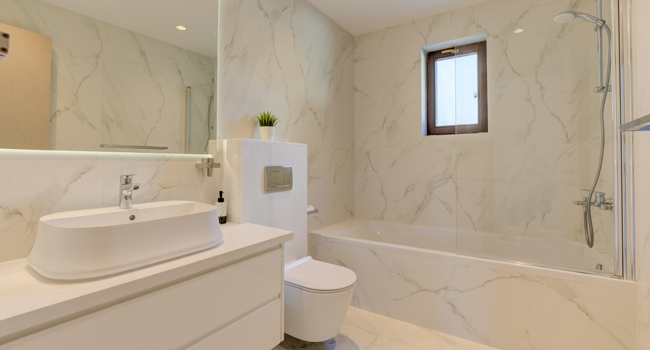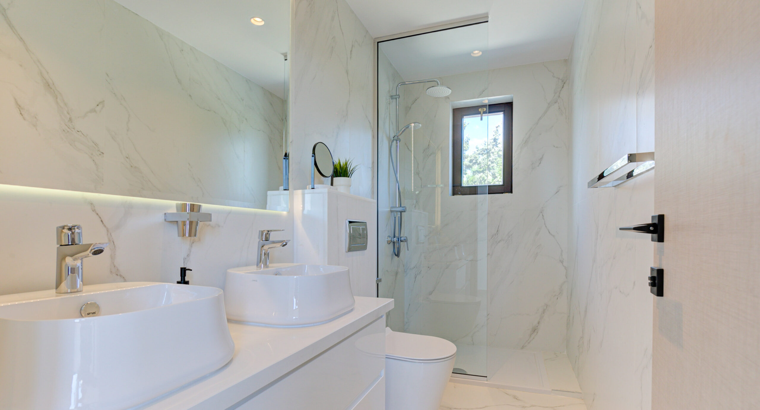 The ground floor hosts two double bedrooms which share a beautiful bathroom. All of the bathrooms in the villa have been modernised with gorgeous marble-style tiles and floating mirrors. The remaining three bedrooms (all doubles) are located on the first floor; the first two share a bathroom (with large walk-in shower), and the beautiful master bedroom has its own ensuite, also with a large walk-in shower. All of the bedrooms have new air-conditioning units as well as ceiling fans, making them super comfortable in the peak of summer too.