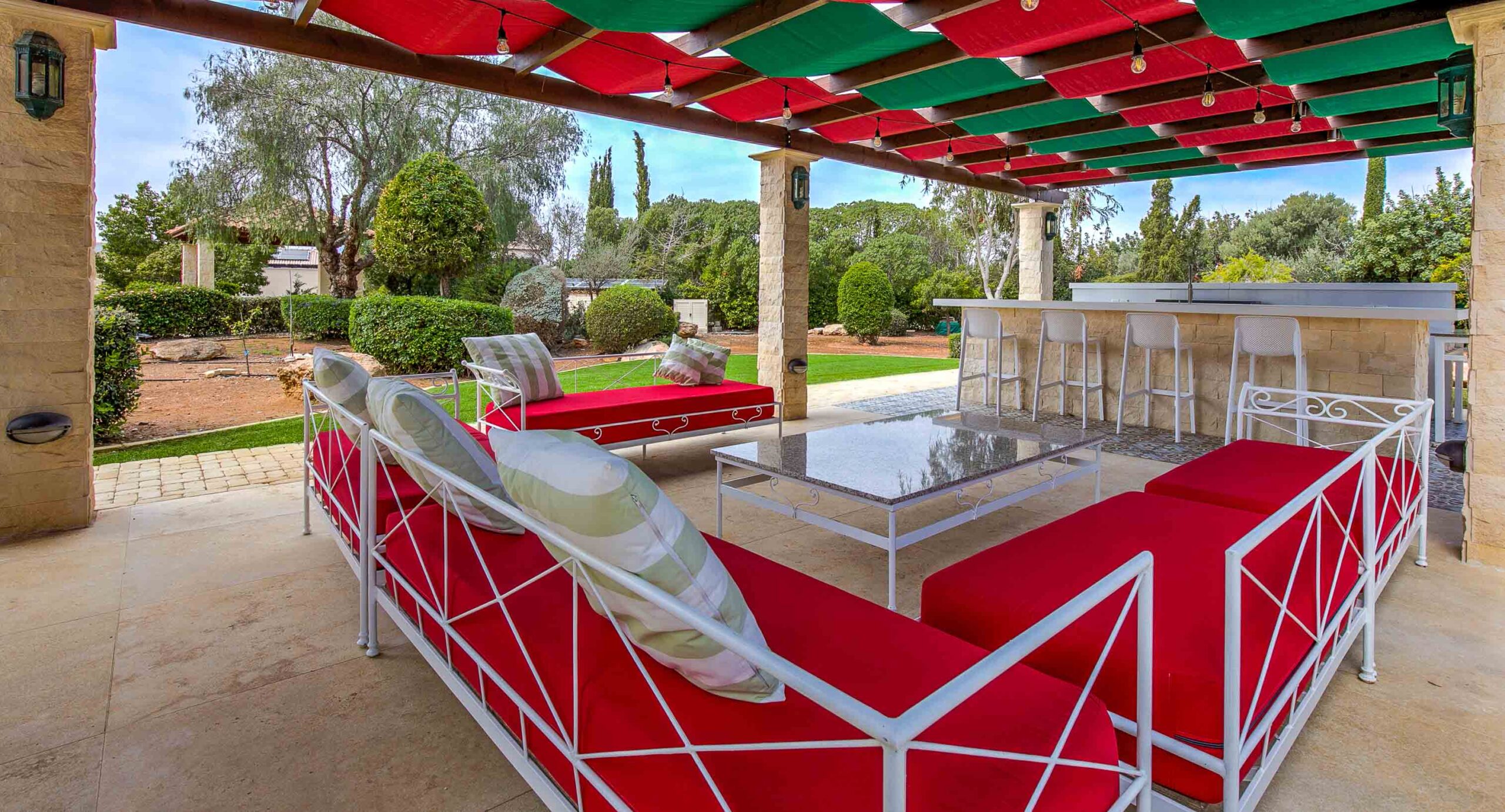 The BBQ area is stunning with its own bar, beautiful lighting, and feature floor tiles – it is definitely one of the villa’s highlights. Around the BBQ area there is also a section of astro turf which is great for kids.