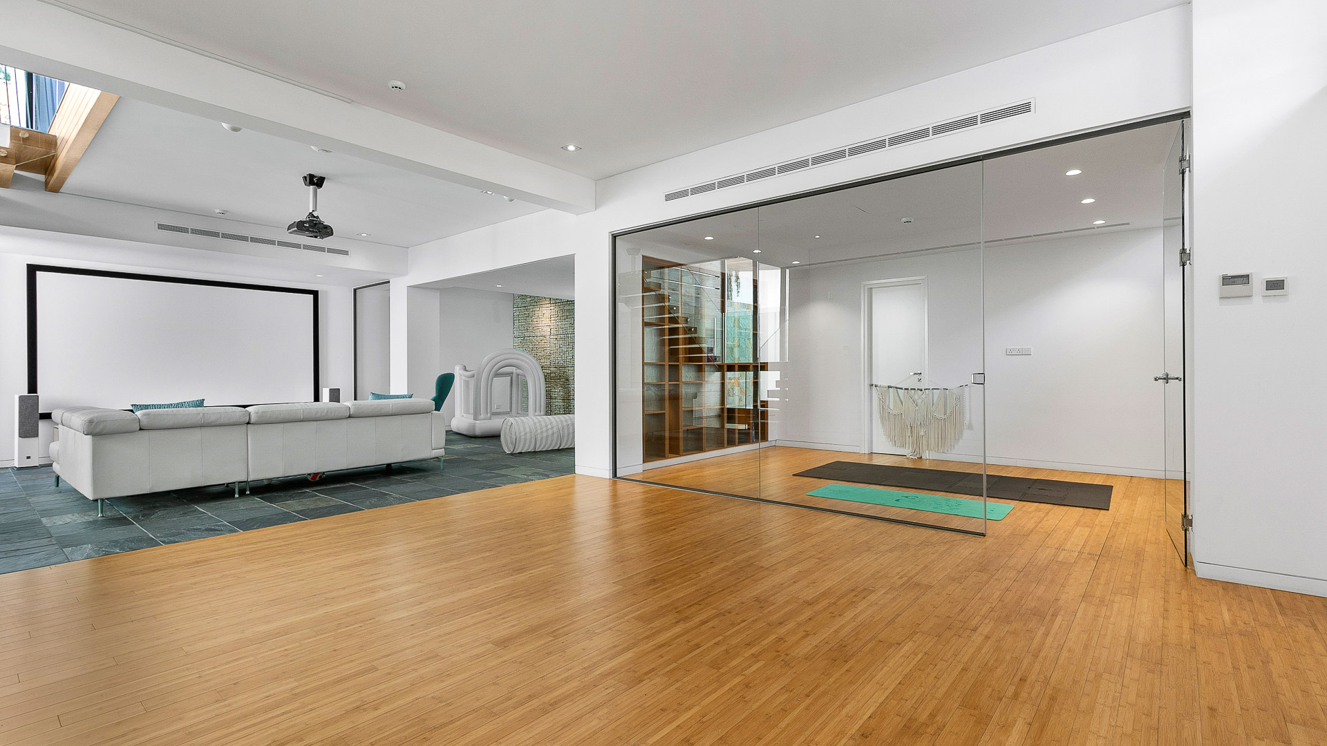 Down the beautifully crafted floating staircase, you have a further two double bedrooms and a separate studio apartment. The ample living space is currently a cinema room, with adjacent wine cellar and Gym room.