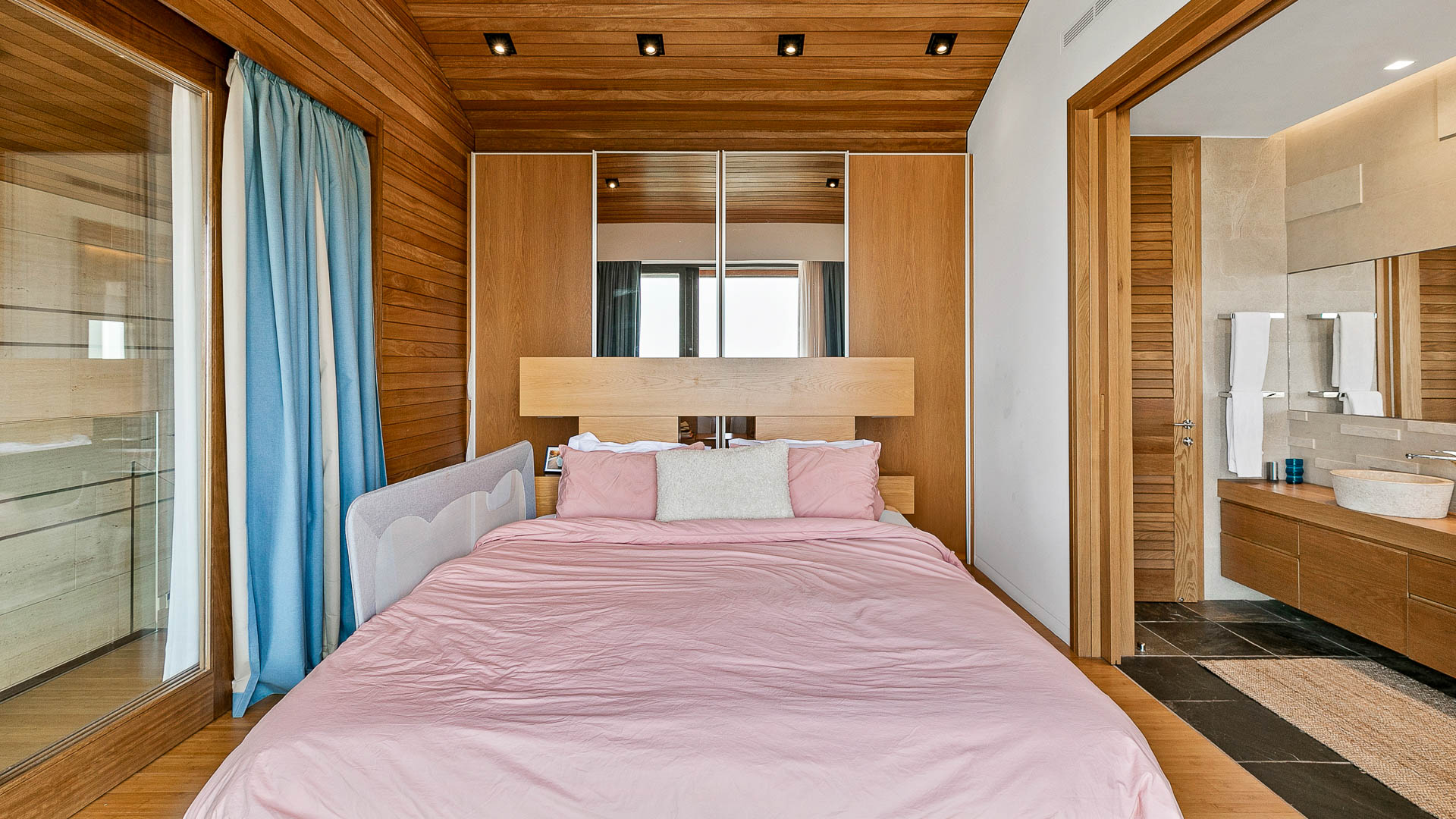 The villa boasts an 11-metre-high central atrium, adding to its feeling of space and natural light. On the ground floor is a spacious sunken living and dining area, beautiful study with full sea views and stunning modern open plan fitted kitchen with a central island work station. A TV den with fireplace and guest cloakroom are also on this level. Underfloor heating and VRV air conditioning system throughout.