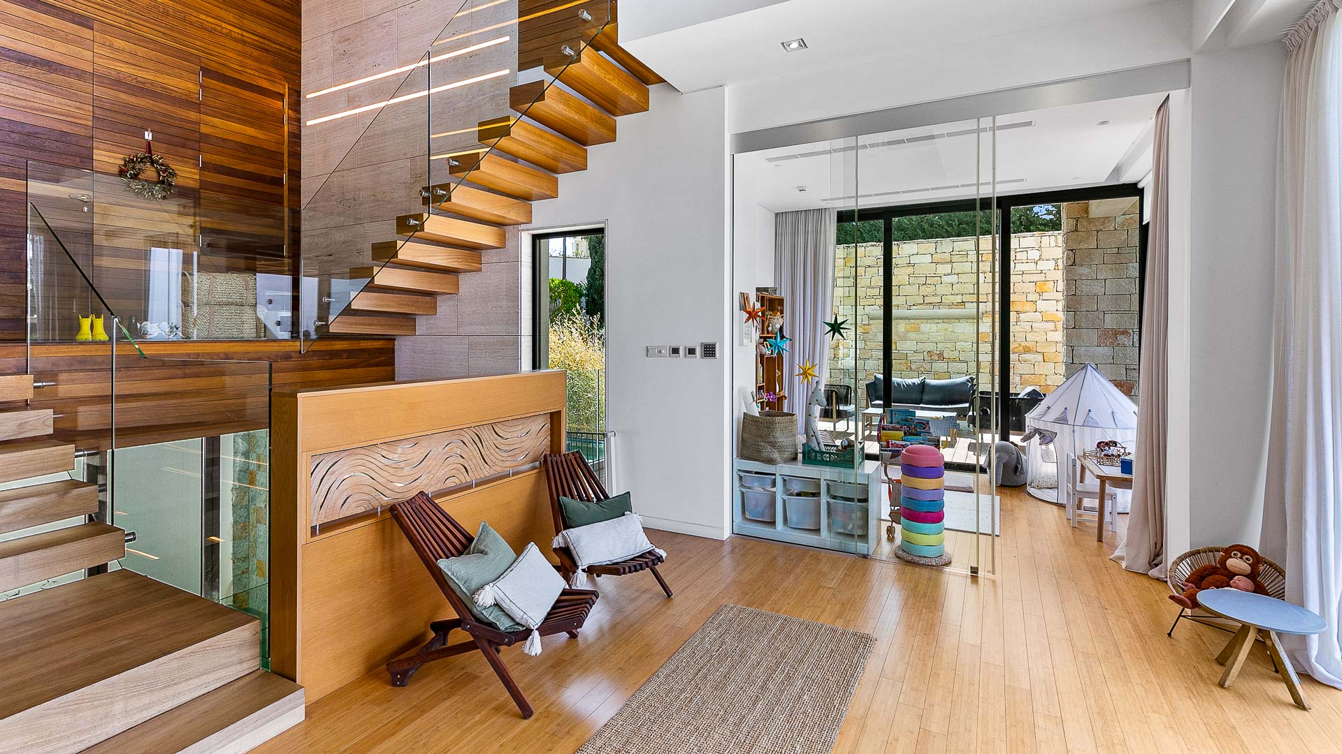 As one enters the Villa through its 3.5 metre height Iroko wood doors into an elevated entrance with its beautiful Italian Travertine stone walls, one immediately sees the Villa in all its beautiful splendour.