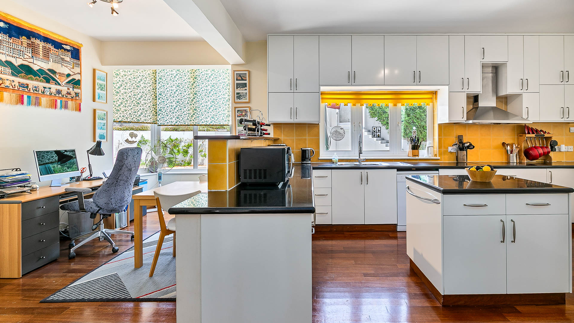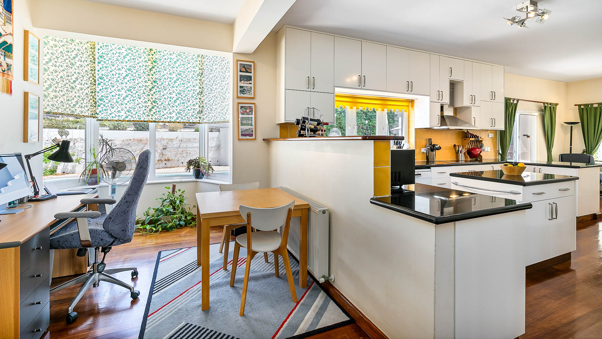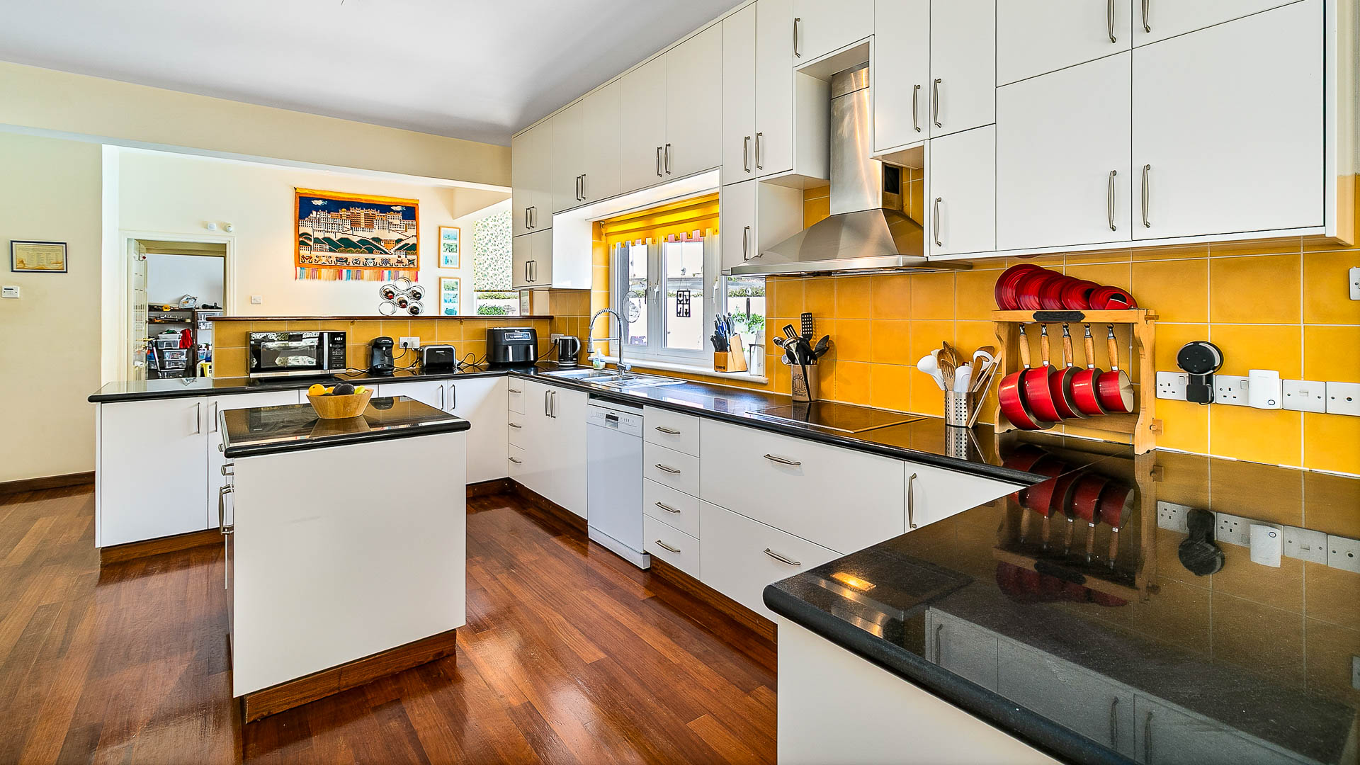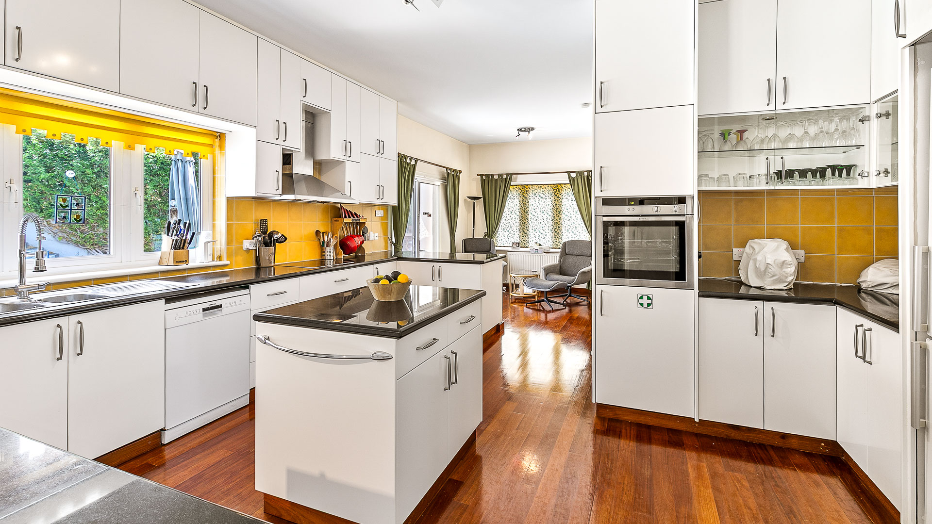 Spanning the back of the house is the super large kitchen/living/dining area. A real family space and hub of the home. White cabinetry and black granite work tops provide ample space for entertaining friends and family. A centre island creates a sociable space. Again light is brought into this amazing home through ample windows. Double patio doors lead out from the snug area to the pool terrace and garden.